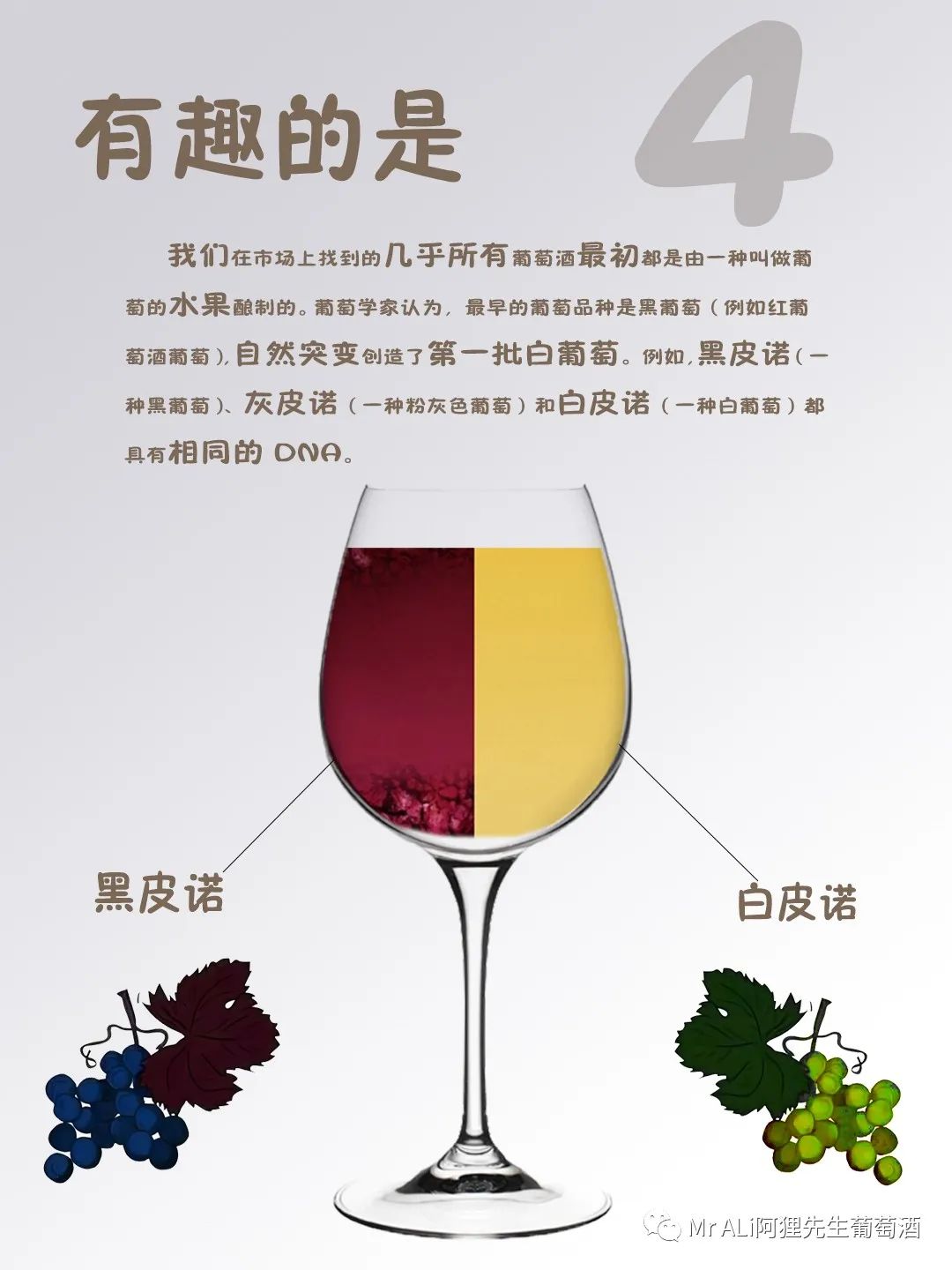 从根本上来说,红葡萄酒是用红葡萄(黑皮诺、赤霞珠等)酿制的,白葡萄酒是用白葡萄(霞多丽、灰皮诺等)酿制的。但有趣的是,我们在市场上找到的几乎所有葡萄酒最初都是由一种叫做葡萄的水果酿制的。葡萄学家认为,最早的葡萄品种是红葡萄(例如红葡萄酒葡萄),自然突变创造了第一批白葡萄。例如,黑皮诺(一种红葡萄)、灰皮诺(一种粉灰色葡萄)和白皮诺(一种白葡萄)都具有相同的 DNA!