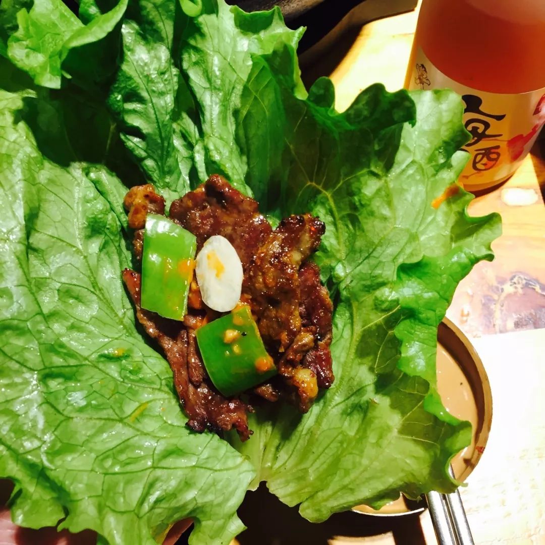 在感觉有点油腻的时候,爽口的生菜搭配烤肉,吃起来也让人很幸福。