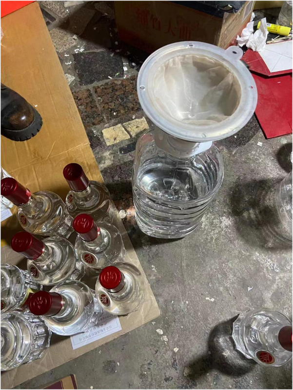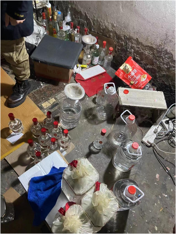 在制假窝点现场,“五粮液®”“国窖®”“五粮春®”等假冒标识白酒堆砌在一起,包装材料、劣质塑料容器盛装的散酒及灌装用漏斗等制作工具杂乱无章地摆满了地上。目前该案已移送公安金牛分局作进一步调查。