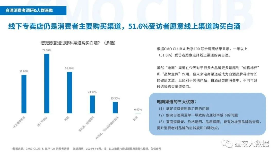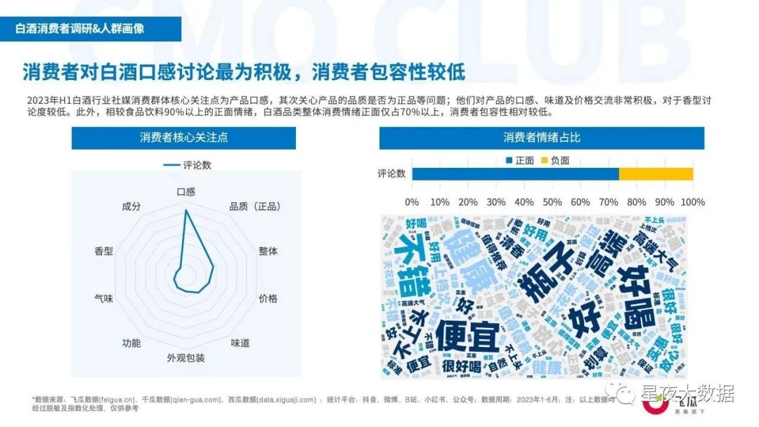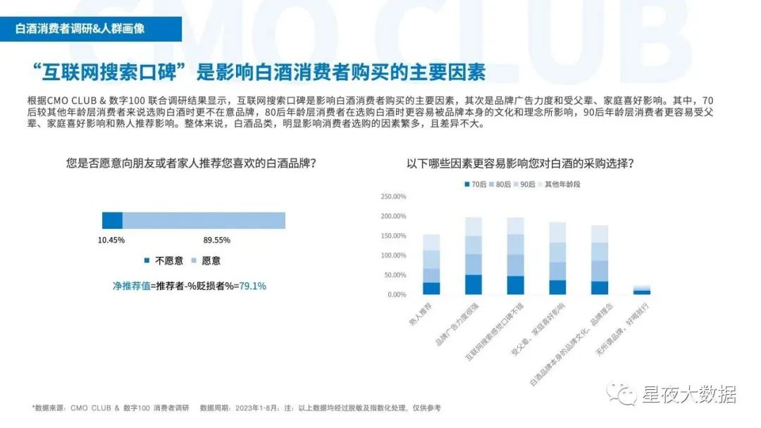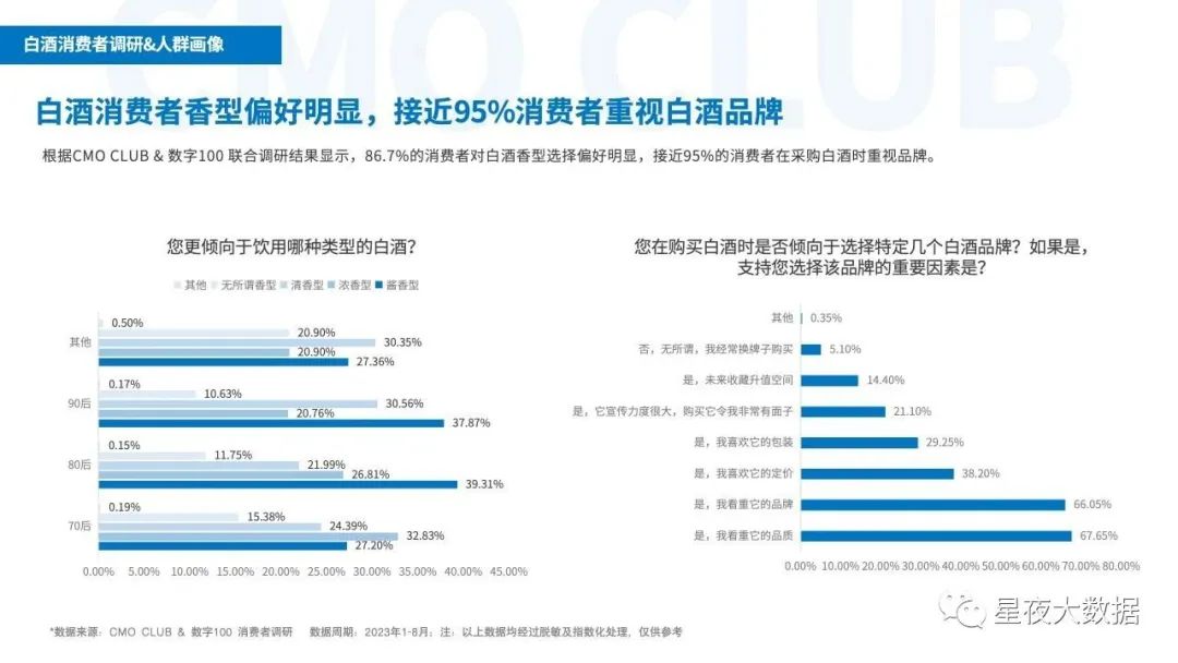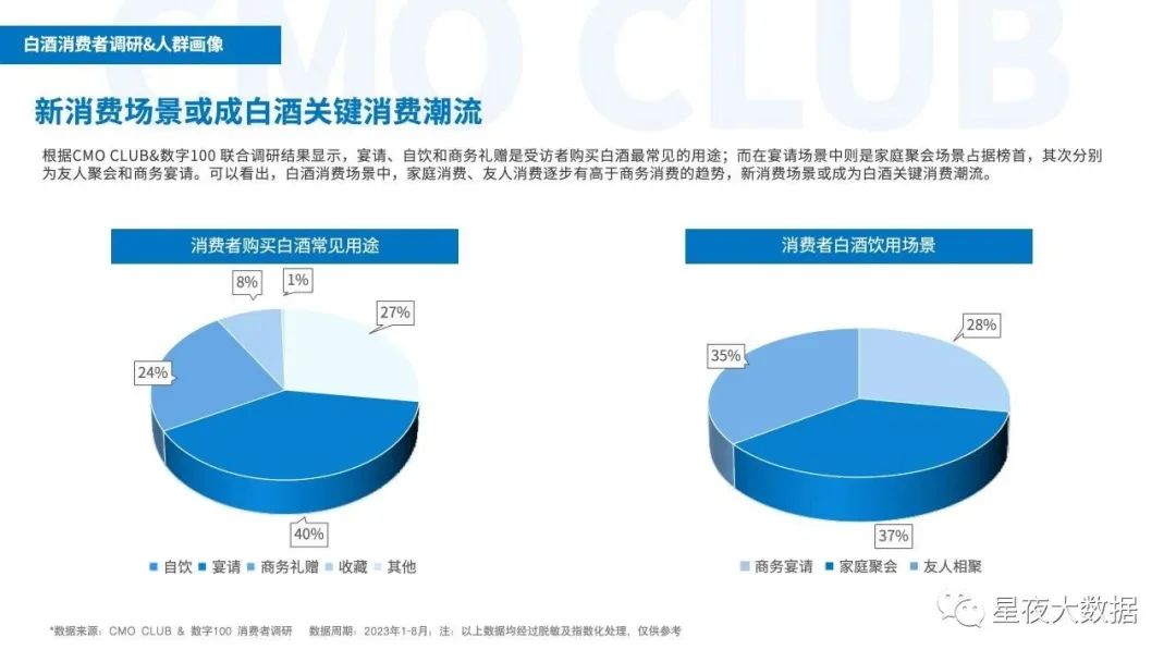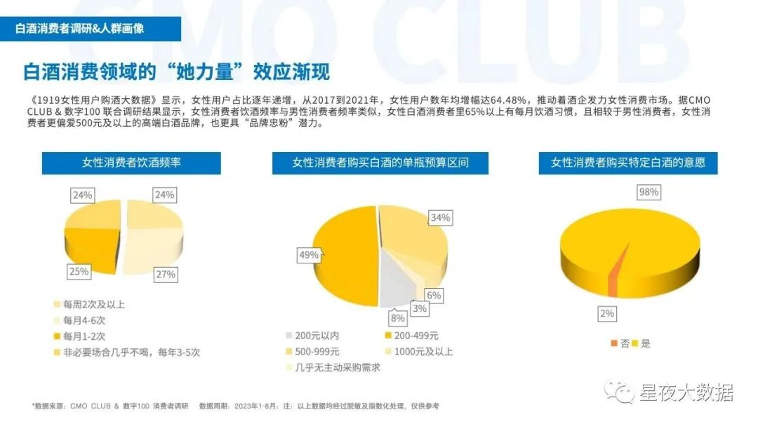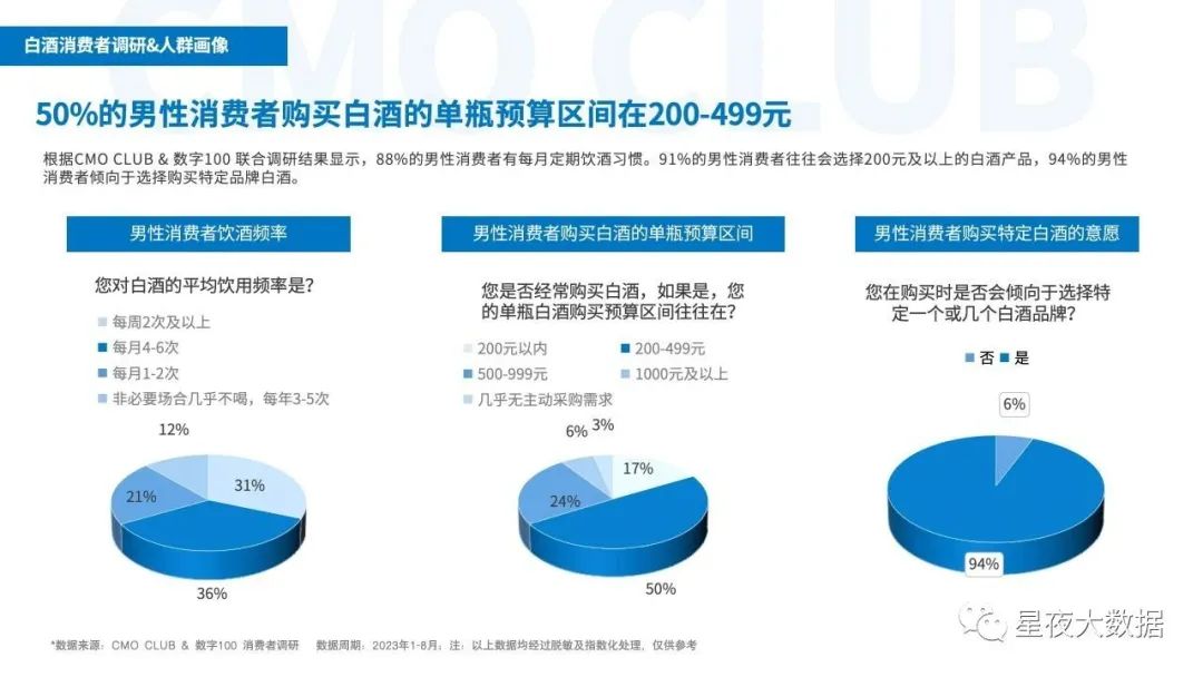 根据CMOCLUB&数字100联合调研结果显示,88%的男性消费者有每月定期饮酒习惯。91%的男性消费者往往会选择200元及以上的白酒产品,94%的男性消费者倾向于选择购买特定品牌白酒。