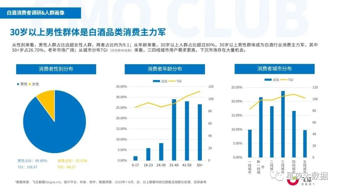 从性别来看,男性人群占比远超女性人群,两者占比约为9:1;从年龄来看,30岁以上人群占比超过80%,30岁以上男性群体成为白酒行业消费主力军,其中50+岁占26.70%,老年市场广阔;从城市分布TGl(目标群体指数)来看,三四线城市用户需求更高,下沉市场存在大量机会。