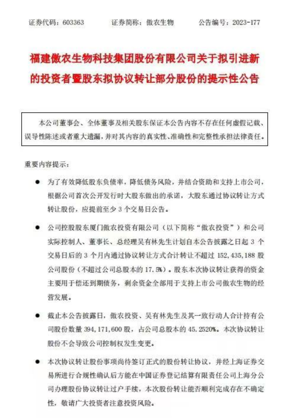 11月17日晚间,傲农生物发布公告,为引进认可公司价值和看好公司未来发展的投资者、优化股权结构,同时有效降低股东负债率,降低债务风险,并结合资助和支持上市公司,公司控股股东厦门傲农投资有限公司(以下简称“傲农投资”)和公司实际控制人、董事长、总经理吴有林先生计划自本公告披露之日起 3个交易日后的3个月内通过协议转让方式合计转让不超过 152,435,188股公司股份(不超过公司总股本的17.5%)。股东本次协议转让获得的资金主要用于偿还到期债务,剩余资金全部用于支持上市公司傲农生物的经营发展。截止本公告披露日,傲农投资、吴有林先生及其一致行动人合计持有公司股份数量394,171,600股,占公司总股本的45.2520%。本次协议转让股份不会导致公司控制权发生变更。