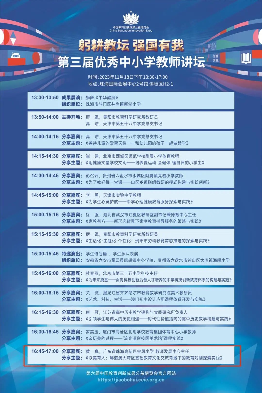 11月18日下午黄真老师受邀参加教博会“躬耕教坛 强国有我”第三届优秀中小学教师讲坛,作为优秀教师代表发表题为《以美育人:粤港澳大湾区基础教育文化交流背景下的教育戏剧探索实践》的汇报。