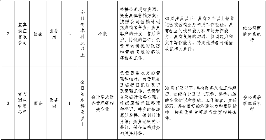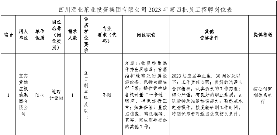 受宜宾市国有企业人力资源中心委托,宜宾人才发展集团有限公司按照公开、平等、竞争、择优的原则,面向社会公开为四川酒业茶业投资集团有限公司招聘4名工作人员。现将有关事项公告如下: