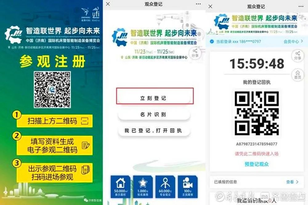 进馆参观者可微信搜索并关注“济南智造展”官方公众号,点击下方中央按钮,打开“预约参观”界面,提前登记预约参展。此外,在登录大厅设置的宣传展架也可现场扫码注册,凭登记回执,现场扫描即可进入展厅参观。