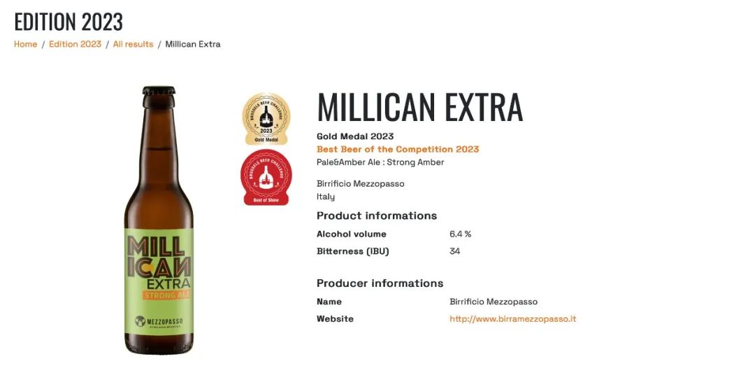 意大利正在证明它不仅可以以葡萄酒闻名,也同样可以是优秀啤酒酿造国。今年BBC中,意大利摘得37枚奖牌,首次排名第二,仅次于比利时。位于阿布鲁佐的Birrificio Mezzopasso以其琥珀啤酒“Millican Extra”赢得了著名的COMAC奖杯,获得比赛的最佳啤酒。