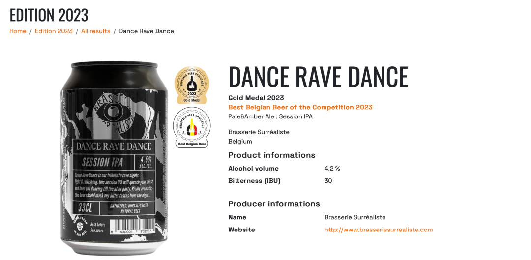 比利时共有400款啤酒样品参赛,是参赛样品数量醉多的国家。其次是意大利、法国、美国、中国、巴西和德国。但值得庆祝的是,布鲁塞尔的一家啤酒厂Braserie Surréaliste凭借其“DANCE RAVE DANCE”赢得了“Session IPA”类别的金牌和最佳比利时啤酒称号。对于3年前在新冠肺炎疫情中成立的一家新星酒厂来说,这是一件非常值得炫耀的荣誉?