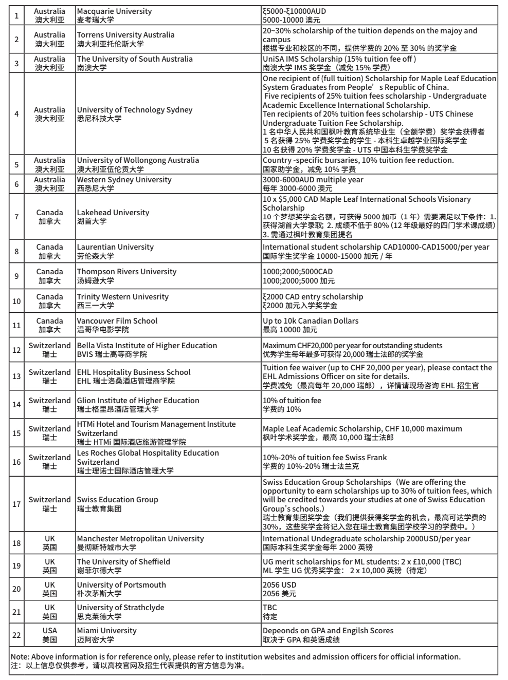 提供枫叶学生独享奖学金的高校