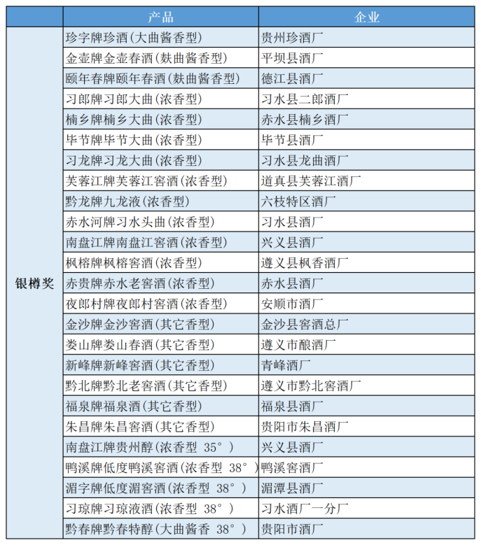 茅台、董酒、鸭溪窖、习酒、安酒、金沙、国台、贵州醇、青酒、珍酒2016年,举办了第二届贵州十大名酒评选活动。此时的茅台已经成功超越五粮液,成为“白酒老大”,并在此届评选活动上荣获“仪狄巨匠金奖”。贵州新十大名酒与第一届十大差距并不大,珍酒作为贵州老牌名酒,重回名酒行列。前些年来酱酒火热,珍酒飞速发展,如今已经成为贵州第二家白酒上市企业(港股上市)。