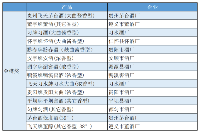 茅台、董酒、鸭溪窖、习酒、金沙、国台、贵州醇、青酒、糊涂酒业、酒中酒2011年,为了发展优势品牌,贵州重新开启停止多年的名酒评选,并选出了新时代的“贵州十大名酒。据上一次名酒评选20多年后,贵州茅台依旧遥遥领先,引领贵州白酒发展;董酒作为国家级名酒同样具有非常高的声望地位;这个时候的习酒,已经告别习水大曲,开始全力发展酱酒。茅台镇三台之一“国台”逐步崭露头角,实力越发强劲。另外除了贵州醇、金沙两个“老熟人”外,青酒、糊涂酒业、酒中酒也成功当选。