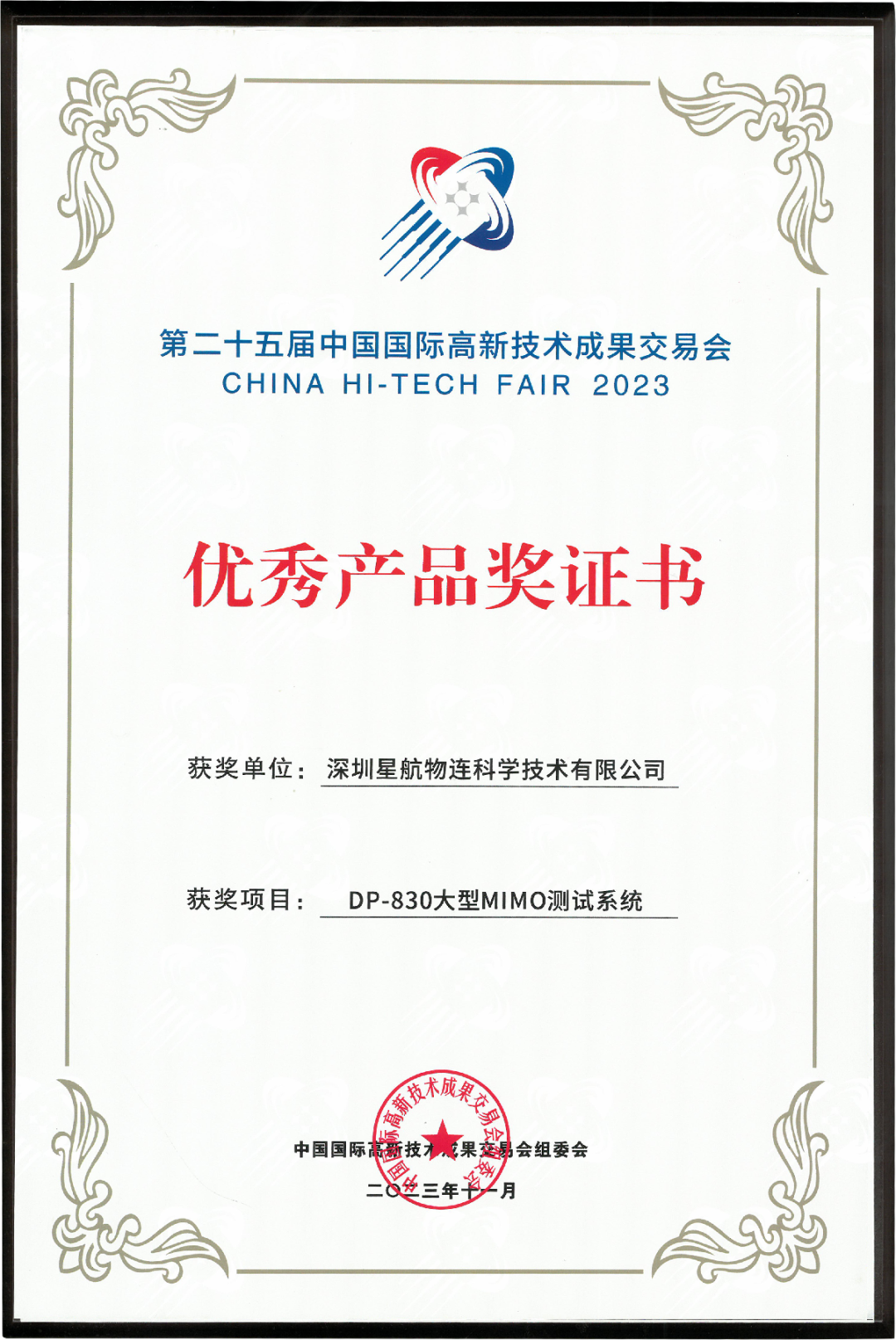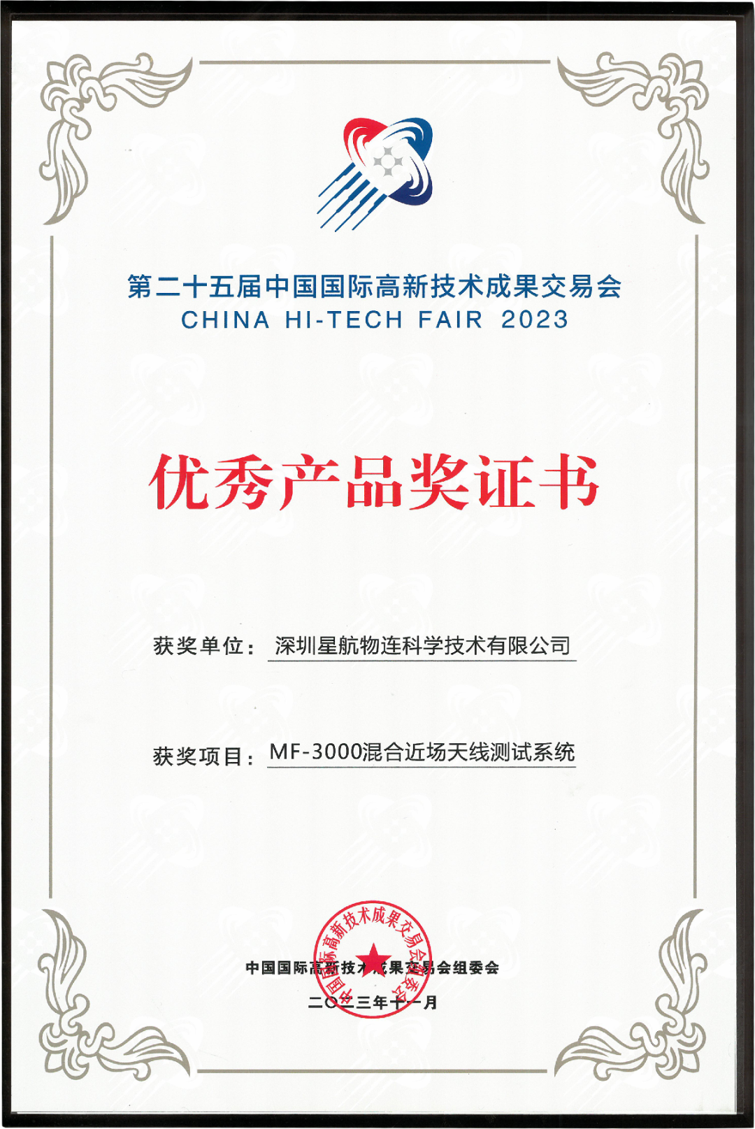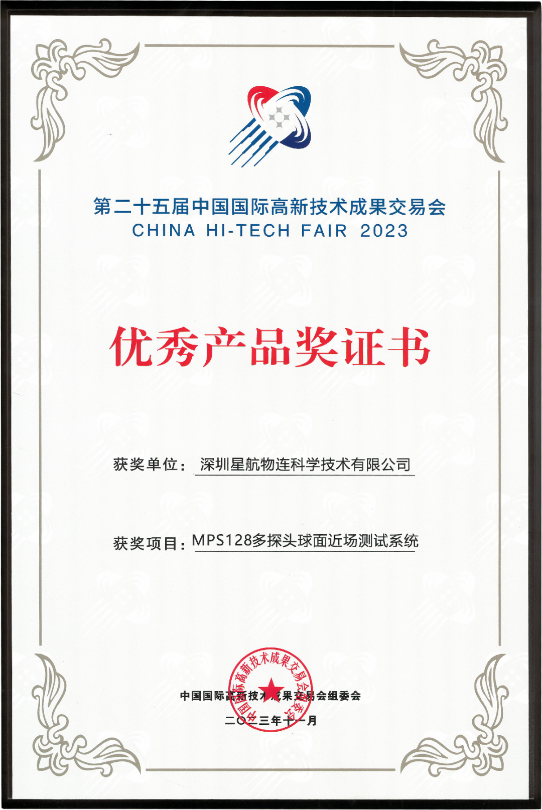 最后,经由专家评审和高交会组委会评选,在众多评选企业中,星航物连携MPS128多探头球面近场测试系统、MF-3000混合近场天线测试系统、DP-830大型MIMO测试系统、CTR-60毫米波紧缩场测试系统、VAT-S整车OTA测试系统、MPS6860多探头测试系统荣获“优秀产品奖”和“优秀展示奖”!