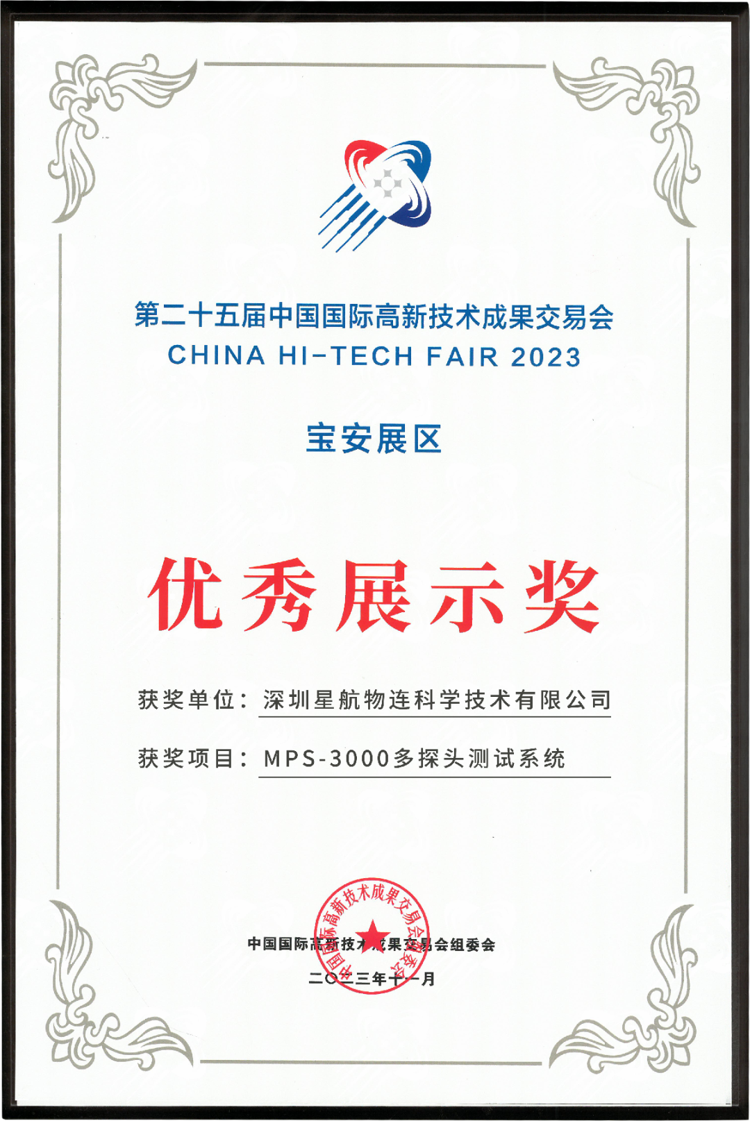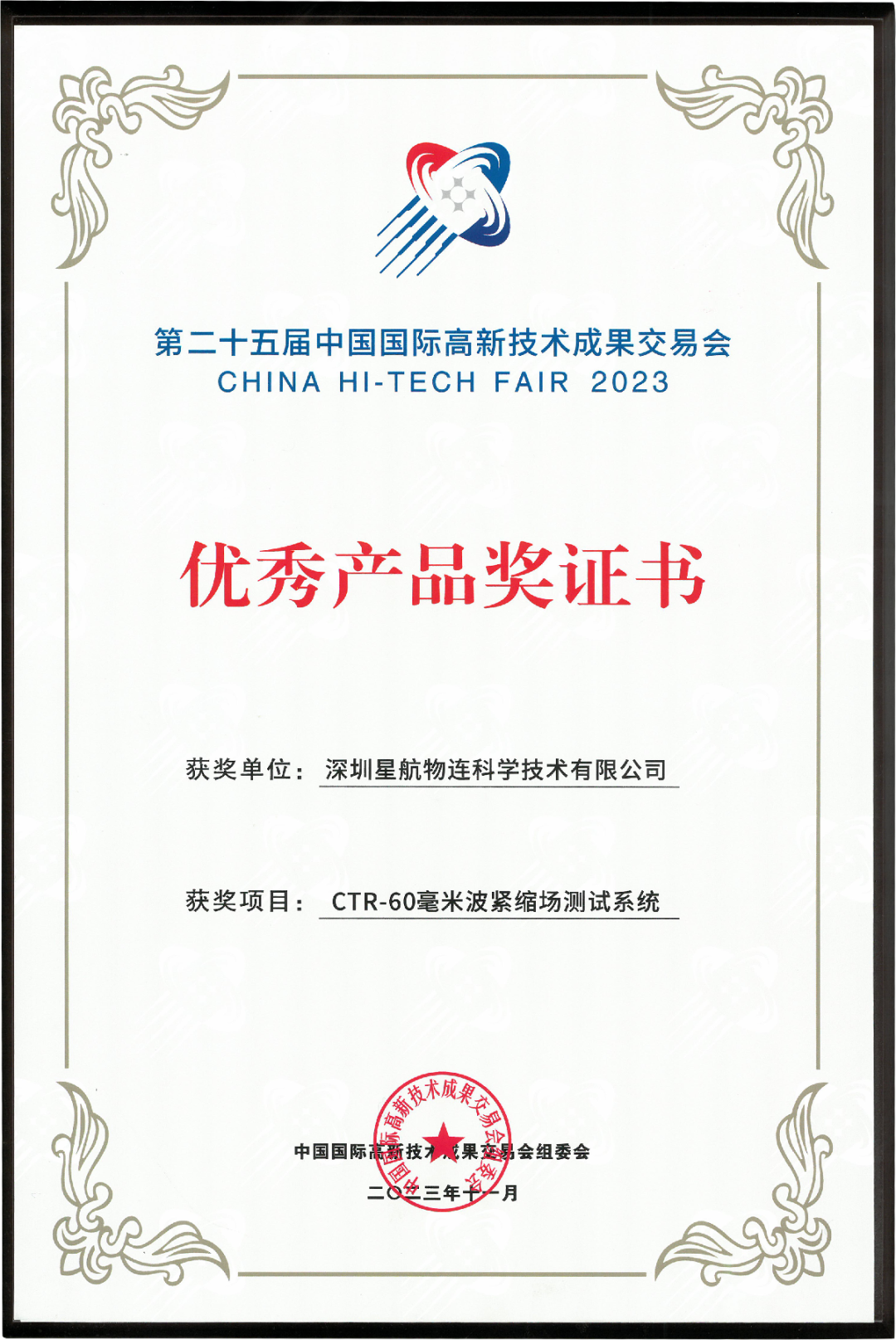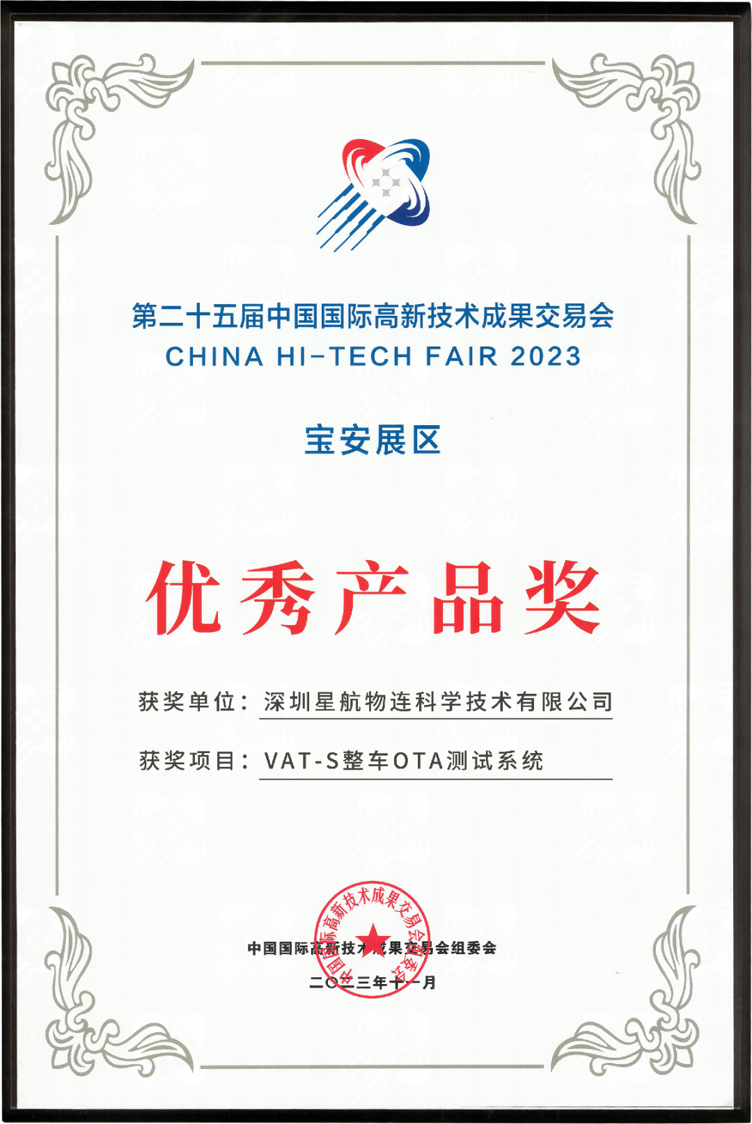 最后,经由专家评审和高交会组委会评选,在众多评选企业中,星航物连携MPS128多探头球面近场测试系统、MF-3000混合近场天线测试系统、DP-830大型MIMO测试系统、CTR-60毫米波紧缩场测试系统、VAT-S整车OTA测试系统、MPS6860多探头测试系统荣获“优秀产品奖”和“优秀展示奖”!