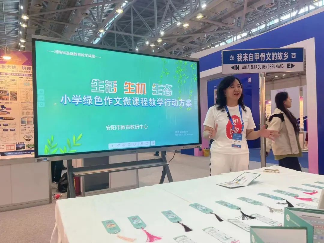 绿色作文,根植于生活,取法于教材,一节节作文微课妙趣更生,使孩子们在作文的天地里自然生长,自在吸纳,赋予孩子们一双自由表达的翅膀。字源识字,通过追溯汉字的本源,分析汉字的结构,利用汉字的构字理据识记汉字。引导小学生科学化,生活化,形象化的识字,提高识字兴趣和识字效率。这是小学语文成果“解读教材里的学习密码”其中的两大主题,安阳市教育教研中心围绕统编教材进行“语文数智资源”研发和应用,旨在打造服务新课标理念下新型教与学方式的系列教学资源。她们的资源设计理念先进,内容丰富,在河南展区颇受欢迎,一批批教师纷至沓来,兴趣盎然。展品是富有安阳特色的甲骨书签,每一片书签上的有微课的二维码可让参观人员随时观看,很多外地市老师纷纷询问网址和更多课例的观看方式。