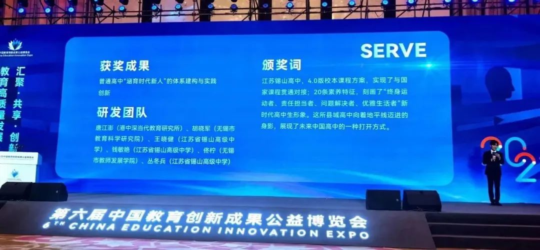 与此同时,第六届中国教育创新成果公益博览会闭幕式上举行了SERVE奖颁奖典礼,正式揭晓SERVE奖获奖成果名单。省锡中《普通高中“涵育时代新人”的体系建构与实践创新》经由评审专家先后三轮评审,从1651项成果中脱颖而出,成为最终的20项SERVE奖获奖成果之一。