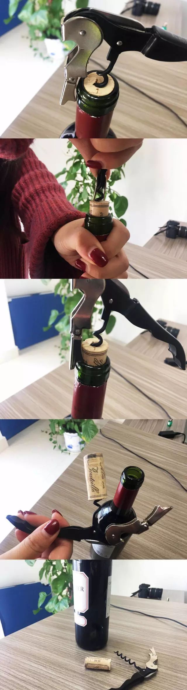 将酒刀第一级杠杆卡在瓶口(小编最初开瓶时就弄错这里,没卡住,手弄得生疼还拔不粗来,大家记得一定要卡住),将木塞拔出一部分,接着再用第二级继续同样操作。如果还没拔出来,可握住酒刀转套处逆时针扭出瓶塞。