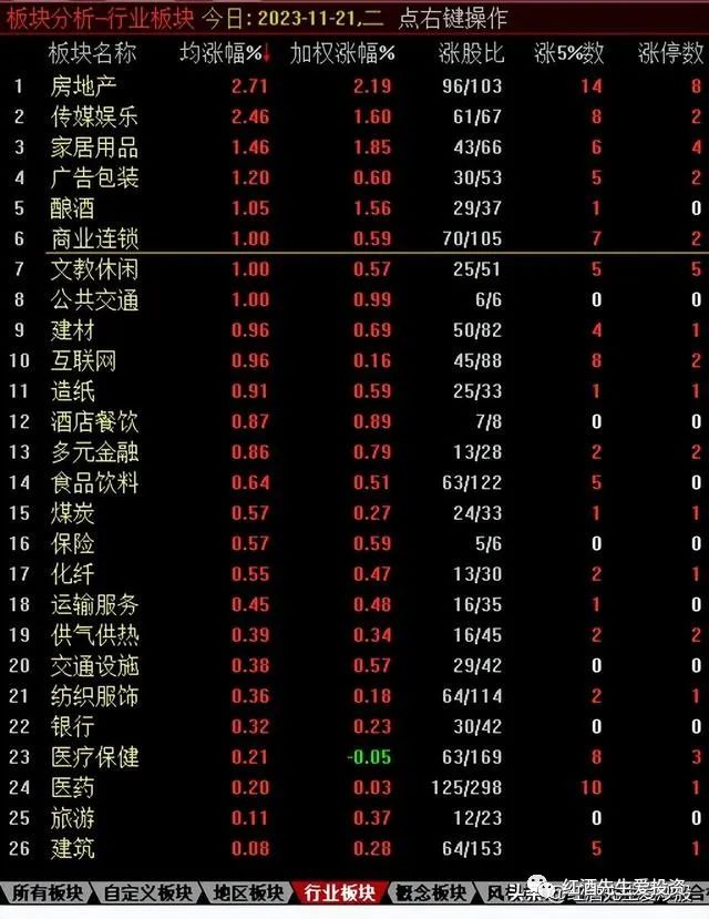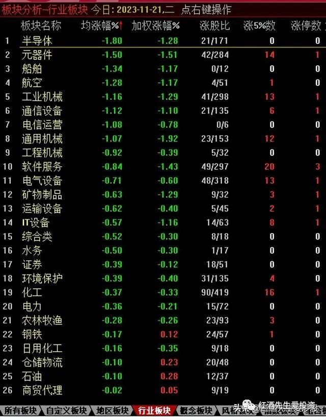 行业个股方面,今天大市值权重股开始轮动,虽然上冲回落,但是属于试探性的上攻实盘动作,并一起做震仓洗盘。中小市值题材股今天多数震荡调整,尤其是科技类板块个股集体展开震荡调整,华为系列概念股经过前面连续东西超买上攻之后,今天都展开震荡调整,所以,我这几天不断提示大家不要追买这类热门题材股,涨多了必跌,而其他滞涨的板块个股会迎来补涨。今天消费类板块个股涨幅居前,半导体元器件领跌两市。