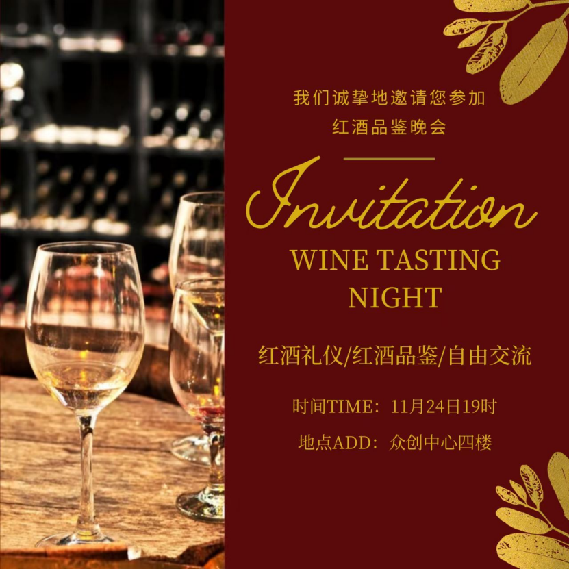 2023年11月24日晚上19:00,大学生创新创业协会将于众创中心四楼举办红酒品鉴会,诚挚邀请全校师生前来参加,一同学习红酒品鉴的相关知识及礼仪。