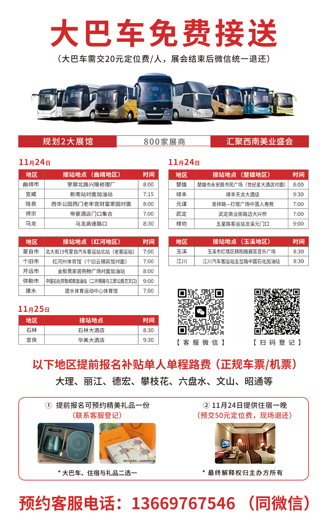 免费大巴车 另外组委会还在周边地区设立免费大巴车乘坐点,为预约的观众提供接送服务,个别较远地区的观众可以享受车票报销福利。多重福利多种选择,但是要记住这些福利都需要和我们的客服联系预约呦。