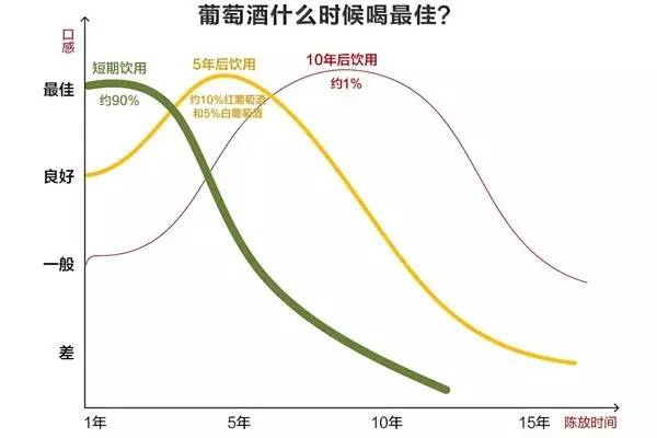 划重点了朋友们!由图可见,90%的葡萄酒最佳适饮期都在一两年内。