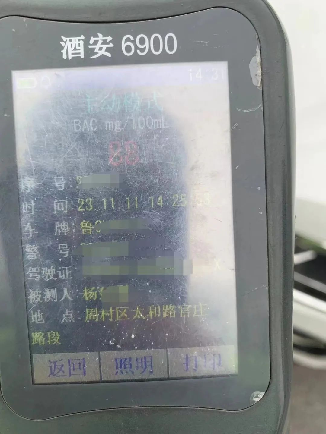 11月11日下午2:20时许,淄博市公安局交警支队周村大队二中队民警巡逻至太和路管庄路段时,示意一名轿车驾驶人停车接受检查,驾驶人杨某非但没有立即停车反而欲加速驶离。很快,民警将车辆和杨某进行了控制。控制住杨某的同时,民警闻到其身上有很浓的酒气。经呼气式酒精检测仪检测,检测值是88毫克/100毫升,涉嫌醉酒后驾驶机动车。