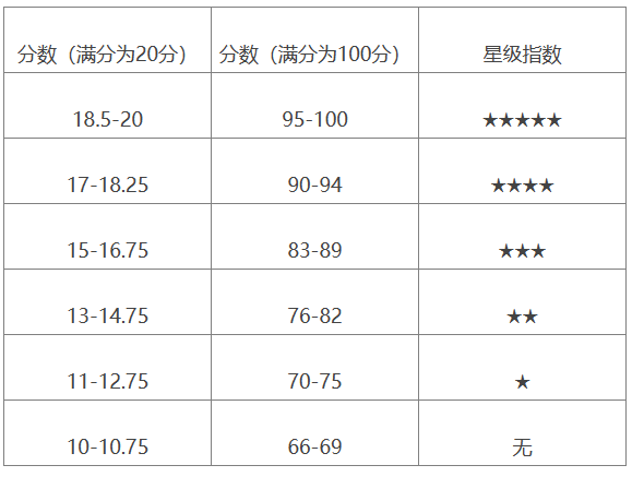 17-15.5分:优秀葡萄酒。优秀的葡萄酒是用于特殊场合的优异的葡萄酒。优秀葡萄酒是其产地风土条件、葡萄树、酿制技术、年份和酿酒师的完美结合。