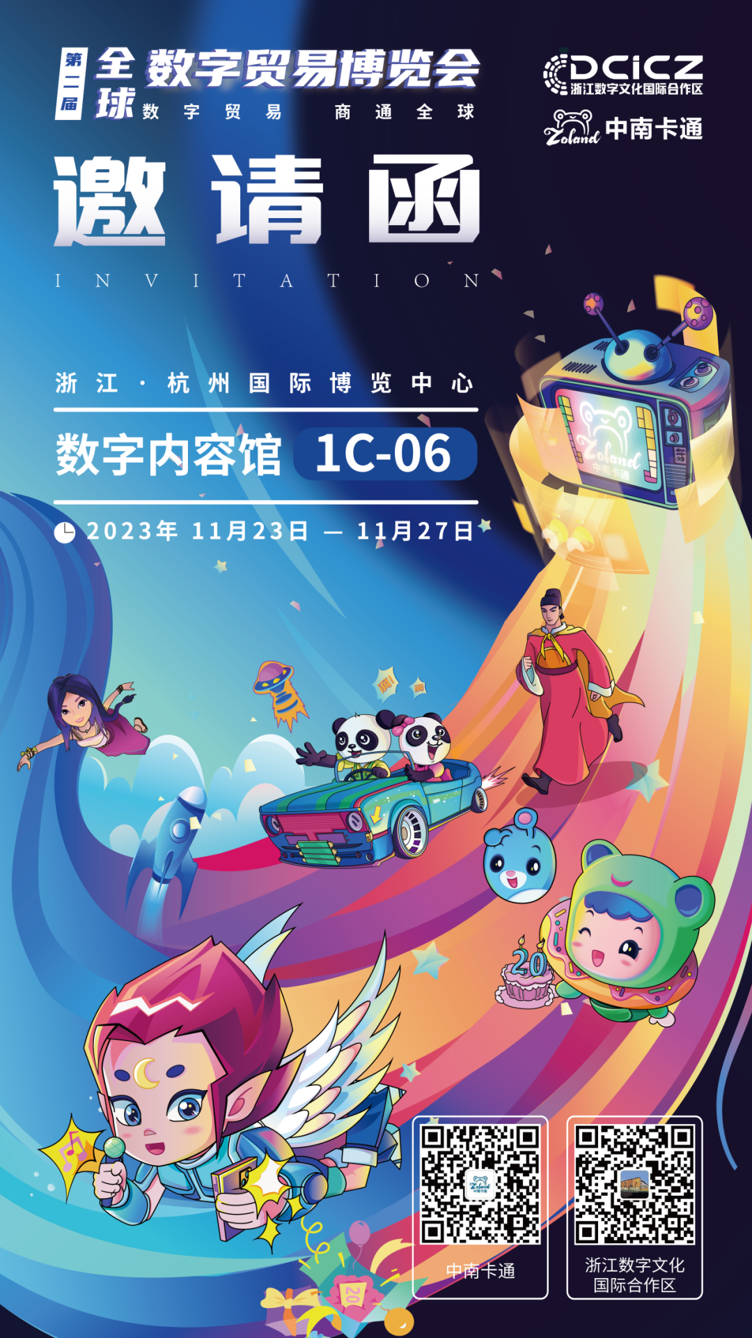11月23日至27日,第二届全球数字贸易博览会将在杭州举办。中南卡通积极响应“数字贸易,商通全球”的展会主题,再次参展,亮相杭州国际博览中心数字内容馆1C-06展位。