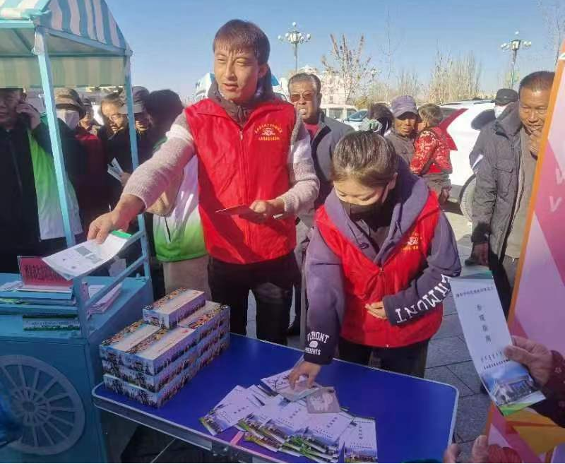 活动中,“流动博物馆”借助宣传展板、发放博物馆宣传手册和文创产品等方式,让群众在家门口就能了解肃北的历史文化、文物古迹,丰富群众精神文化生活。