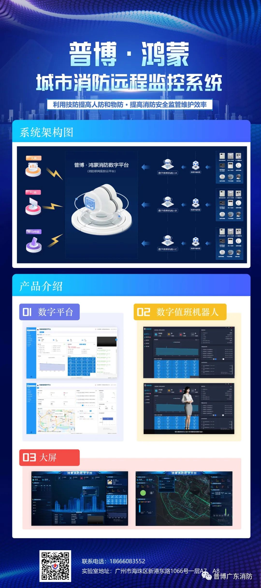 普博消防系列产品包括消防灭火能力保障系统、消防管网监控系统、消防应急智能疏散系统、消防管网监控云平台、图像型火焰探测系统、电气火灾监控系统、消防设备电源监控系统、防火门监控系统、普博 · 鸿蒙城市消防远程监控系统及数字值班机器人等。