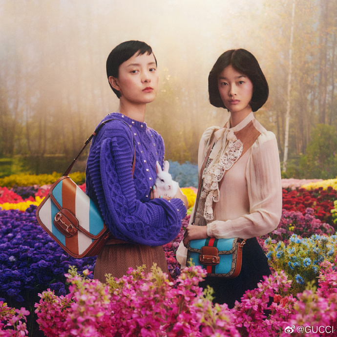 延续 Gucci 一贯绚丽印花的风格,影片让人置身于一座梦幻花园,以缤纷的色彩勾勒春日图景。随着一场乱花迷人眼的花园游玩,主角们和兔子一块将轻松、愉悦的氛围传递出来。不仅产品、影片有兔子出场,背景音乐歌词里的「chasing rabbits」也呼应着生肖兔年。
