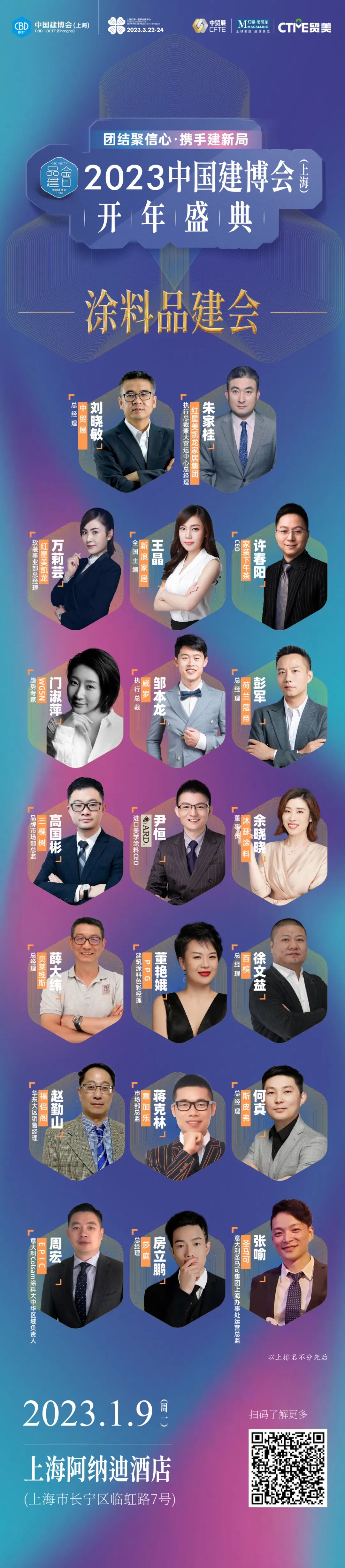 新形势新变化引来新机遇,2023中国建博会(上海)将为大家居产业构建发展新格局,激发行业高质量发展的巨大动能。鉴于此,本届开年盛典以“团结聚信心,携手建新局”为主题,特邀中国大家居建装行业领导、设计师、趋势机构、家装渠道、行业媒体人士等,开展品牌营销招商发布,建装行业年度盘点,潮流趋势及家装渠道分享,高定设计渠道及大宅精装分享,家居行业宏观形势分析,高端对话2023趋势及造势等。期间举办的涂料“品建会”及高端定制“品建会”将重新解构涂料、高定、进口及门窗,助推行业用好机遇、乘势而上,培育塑强竞争新优势。