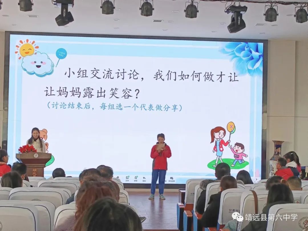 此次观摩活动展示的是由苏向玲老师带来的“为了母亲的微笑”的主题班会课。开始前,苏老师就以《妈妈的爱》的视频营造了良好的课堂氛围,引起了学生的强烈共鸣。随后苏老师出示了一份调查问卷,询问孩子在家和母亲的相处模式,引发学生的思考。接着一场真实的校园情景剧让学生更加清晰地认识到了平时和母亲之间存在的问题。紧接着,苏老师问孩子们:“我们要怎样才能让妈妈露出笑容?”以小组为单位,大家认真思考,最后小组派代表分享讨论结果。结束时,苏老师语重心长地告诉孩子们:爱妈妈不仅要表现在语言上,还更应该表现在行动上。