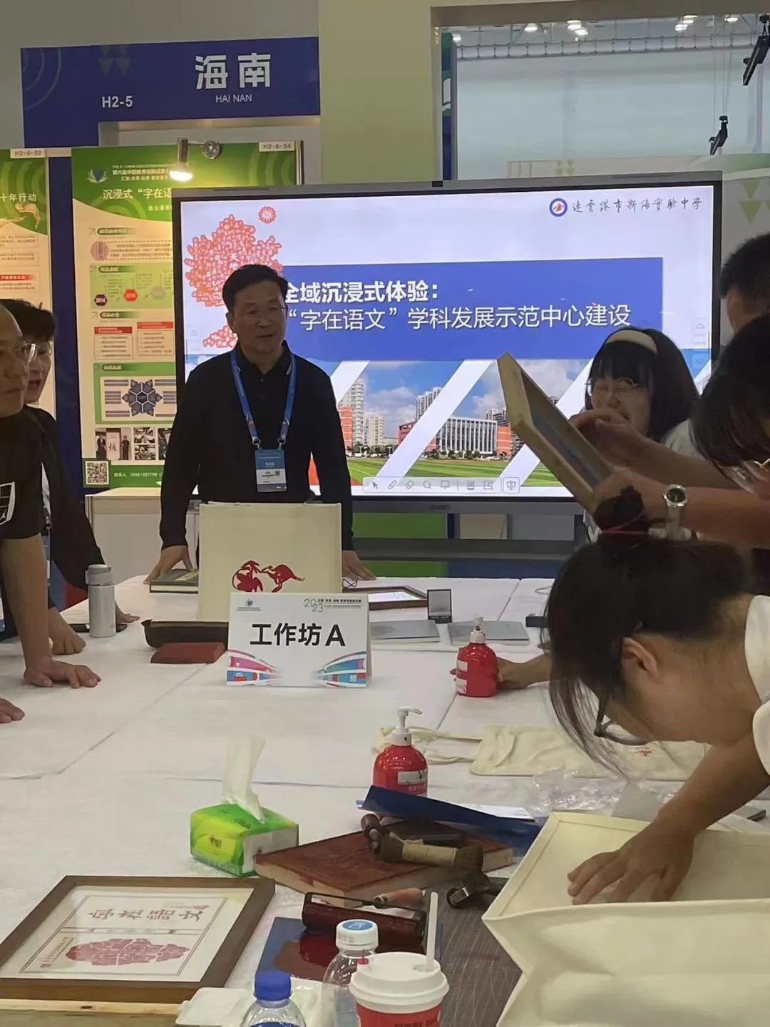 “字在语文”沉浸式体验的实践探索项目作为江苏优秀成果亮相教博会。“字在语文”省级学科示范中心是新海实验中学在2014年成功获得第二届汉字听写大会总冠军后,立足打造汉字校园文化的背景下创建而成。校园文化以汉字为主要元素,注重亲身体验,让学生能够在体验中追溯汉字源流,感受汉字文化。在几年的持续创建后,学校汉字文化特色彰显,开发了十来个汉字体验项目,学校汉字文化建设形成系列;在课程建设上和国家课程有机结合融合,使汉字的基础作用得以彰显,同时开设了众多汉字课程,出版了相关汉字校本课程教材。