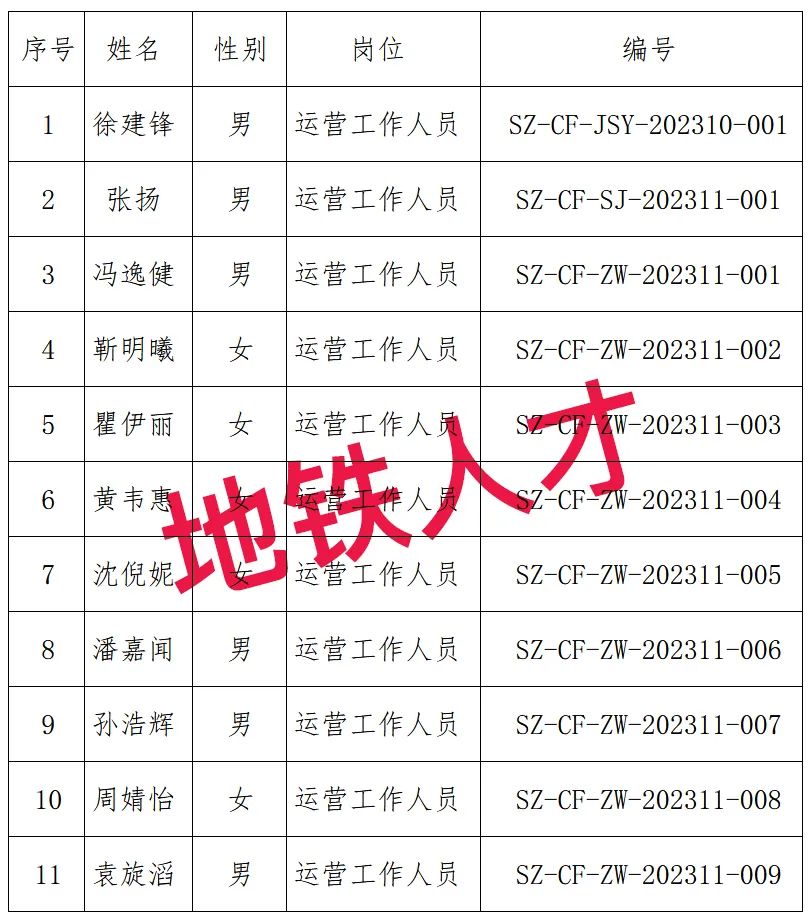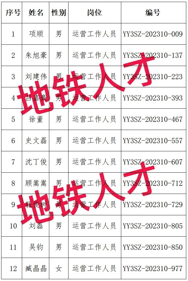 2、12人!上海地铁第三运营有限公司2023年10月招聘录取名单公告