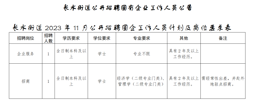 因工作需要,长水街道决定面向社会公开招聘国企工作人员,现将有关事项公告如下:本次计划招聘国有企业工作人员2名,具体岗位及要求见附件1。