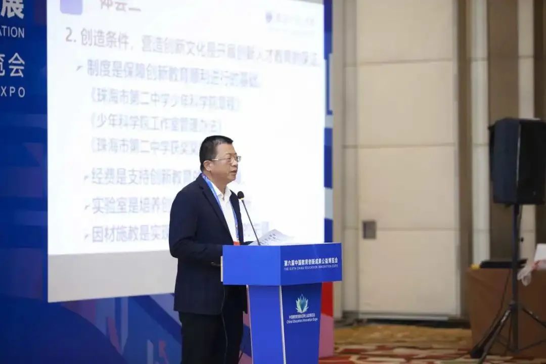 11月19日下午,珠海市第二中学教育集团总校长,珠海市第二中学党委书记、校长郑军受邀在该专题研讨会上作《适性扬才,促进创新人才培养——珠海市第二中学科技创新教育实践》主题演讲。