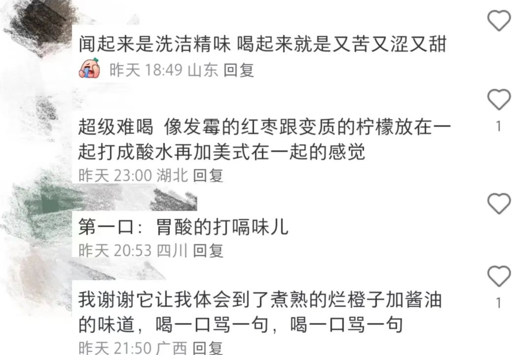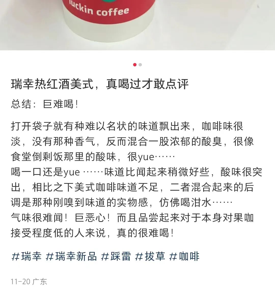 消费者们“避雷”的“雷”,主要在于热红酒美式的味道,“红酒+咖啡”的组合并不是每个人都欣赏得来,有亲身尝试过的消费者如此点评:“咖啡味很淡…混合一股浓郁的酸臭,很像食堂倒剩饭哪里的酸味,yue……”“二者混合起来的后调是那种刚嗅到味道的实物感,仿佛喝泔水……”