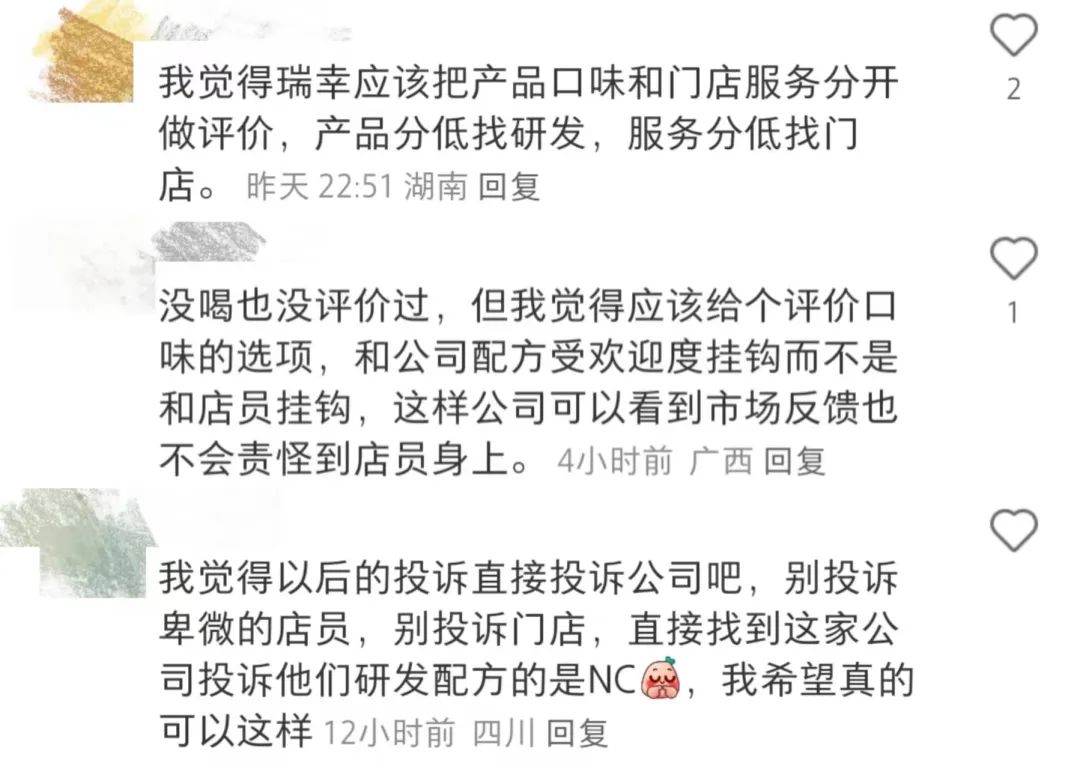 还有网友提出,门店被差评“误伤”是瑞幸的问题,不能因公司管理原因,限制消费者表达的机会。“冤有头债有主”,瑞幸应当考虑将评价体系分成产品研发和门店服务两种,产品分低找研发,服务分低找门店,两套系统的人员犯错不连坐,这样才能更加精准地得到反馈意见。