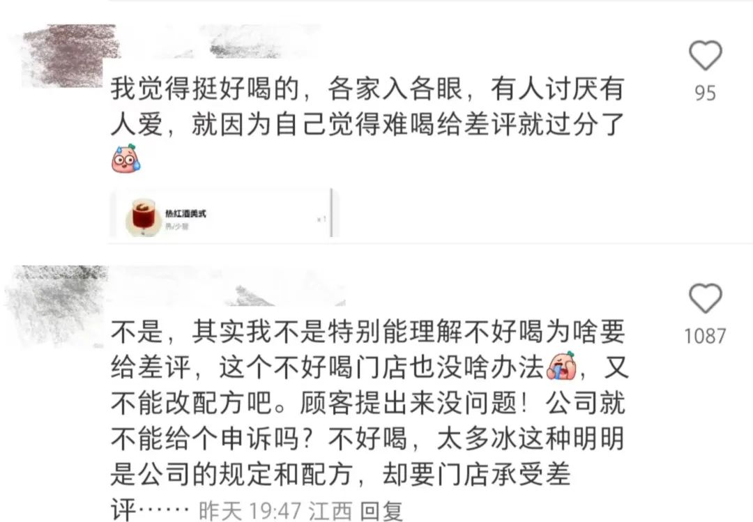 有人讨厌有人爱,但有瑞幸打工人表示,部分不爱的消费者将差评打给门店后,门店从上至下相关人员或许都要受到牵连。因此, 网友们对于不合口味就差评这件事表示不解,即使收到巨多差评,门店方也无法擅改产品配方,“明明是公司的规定和配方,却要门店承受差评......”