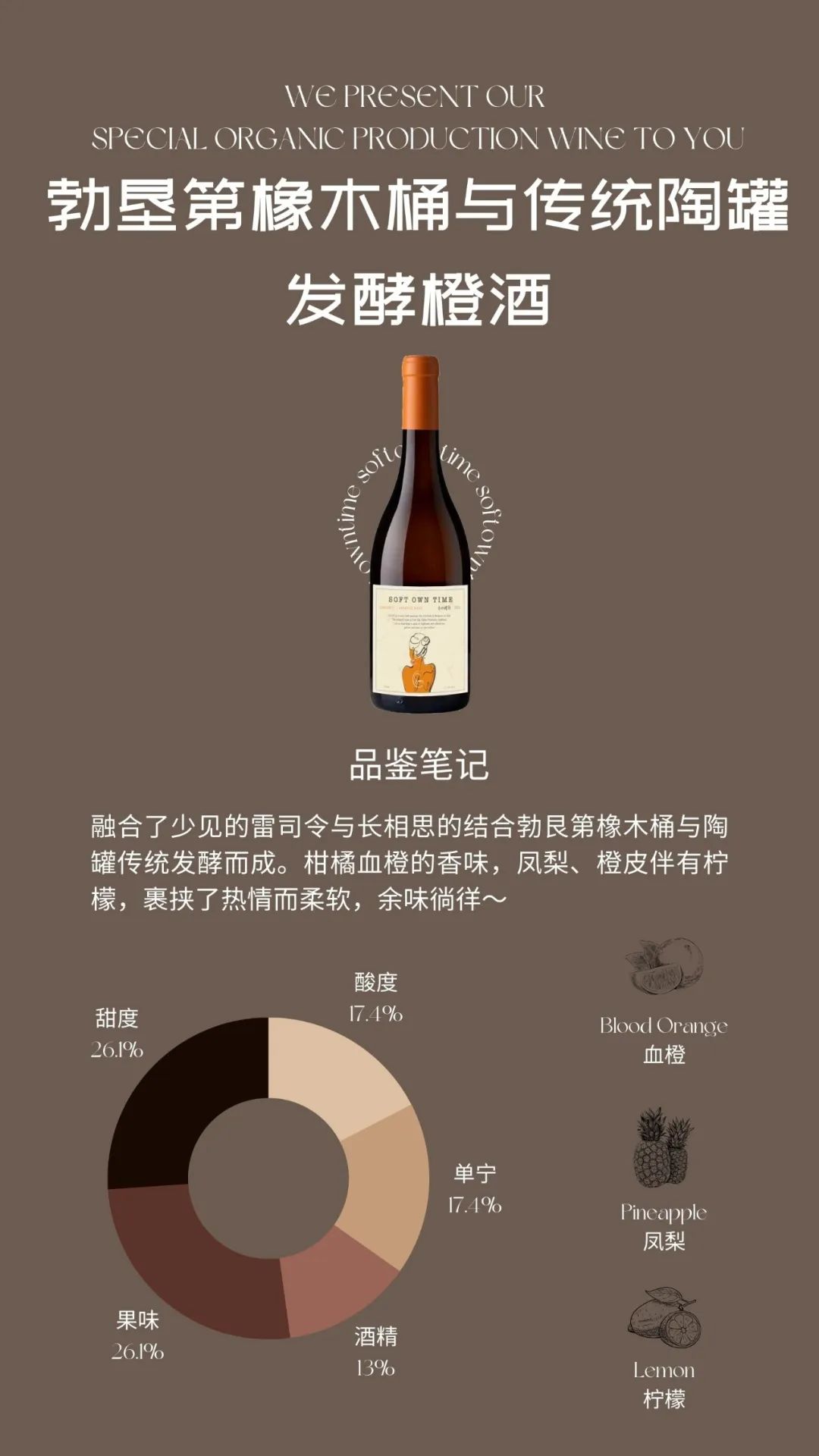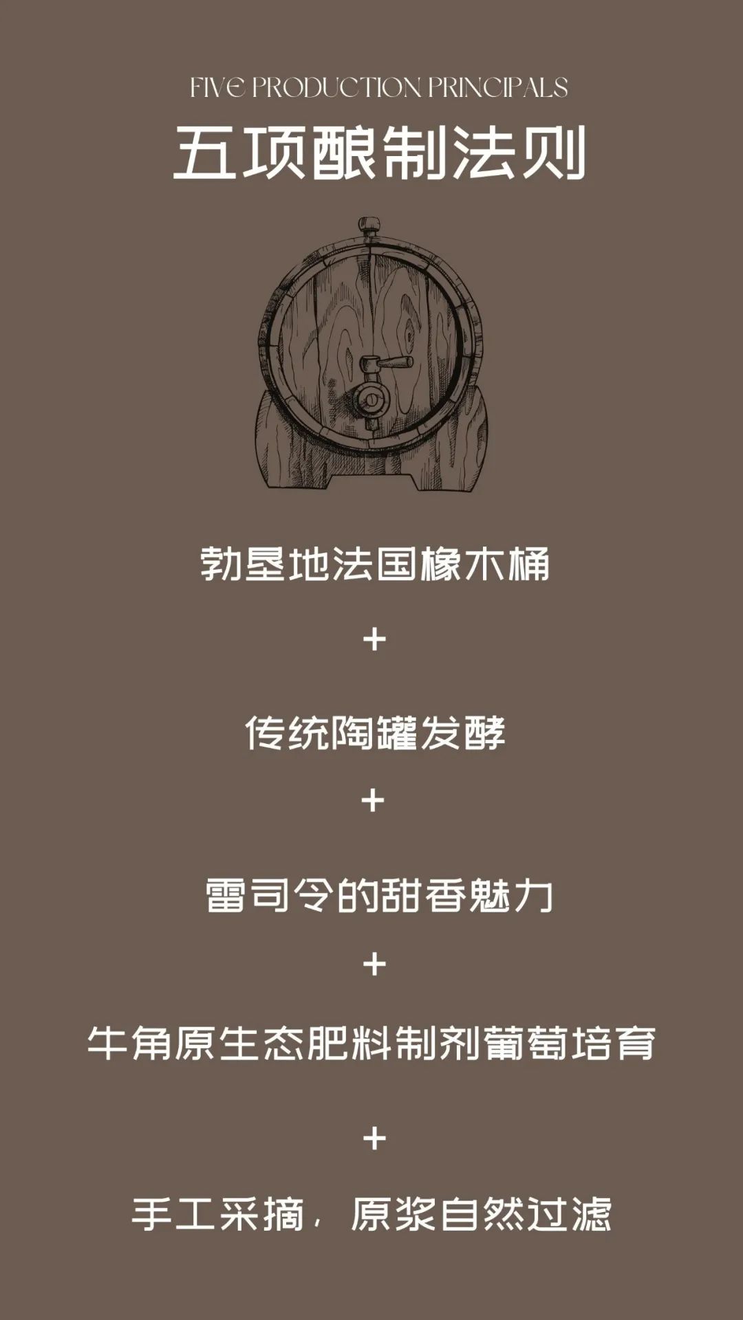 橙酒在橡木桶发酵的同时,采用传统陶罐二次发酵,融合了中国传统的造酒工艺,中西合并,营造独特风味!国内产区少见雷司令葡萄酒,本品融合了部分高档雷司令,使其具有非常丰富的口感和芳香味,适合搭配高档的海鲜、禽肉等食物。引入的生物动力(BD)制剂的现代简写名称,称为牛角肥。准备工作包括用牛粪填充牛角,在冬季将牛角埋在地下数月,然后在春季提取。准则五,手工采摘,分选、除梗、入罐,全过程天然手工工艺采收依旧在早上6点开始。虽然这个季节,酒庄的早晚已经非常冷了,但是白天阳光很好,天气晴朗,因此并不感觉到冷。有秋日的温暖和微凉,非常舒服。全系产品采用纯手工采摘、分选、除梗、入罐,纯天然手工过程。