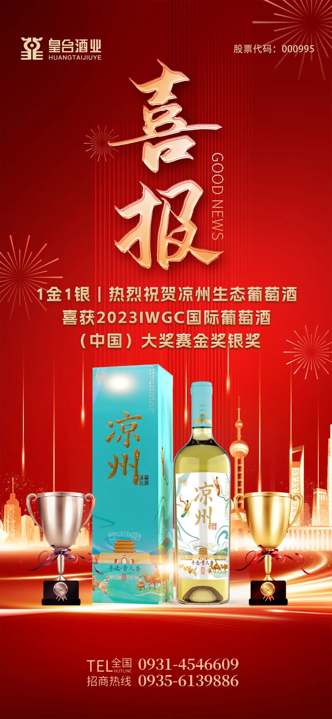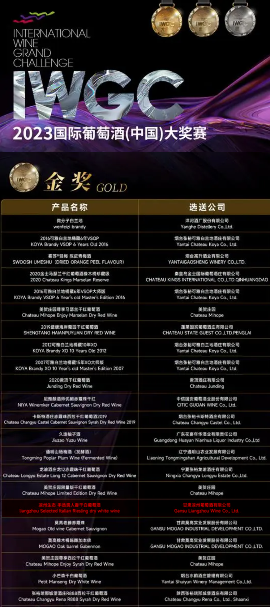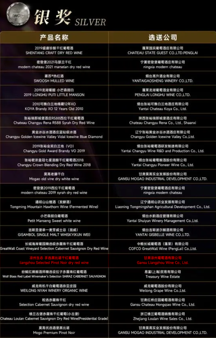 11月18日,2023IWGC国际葡萄酒(中国)大奖赛颁奖仪式在海南·海口国际会展中心隆重举行。IWGC国际葡萄酒(中国)大奖赛汇聚国内外酒款,参赛企业覆盖国内17个省份和法国、德国、澳大利亚、智利等多个国家的优质产区,参评产品达到537款,包含葡萄酒、白兰地、威士忌、果酒、配制酒、露酒六个品类。在此次大赛上,皇台酒业旗下的甘肃凉州葡萄酒有限公司所生产的“凉州生态·手选贵人香干白葡萄酒”和“凉州生态·手选黑比诺干红葡萄酒”,以优异的品质在激烈的角逐中脱颖而出,分别斩获了金奖和银奖。