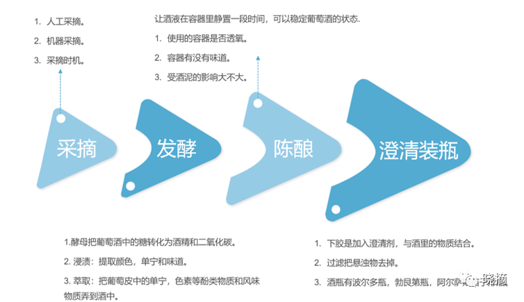 采摘,发酵,陈酿,澄清和装瓶。