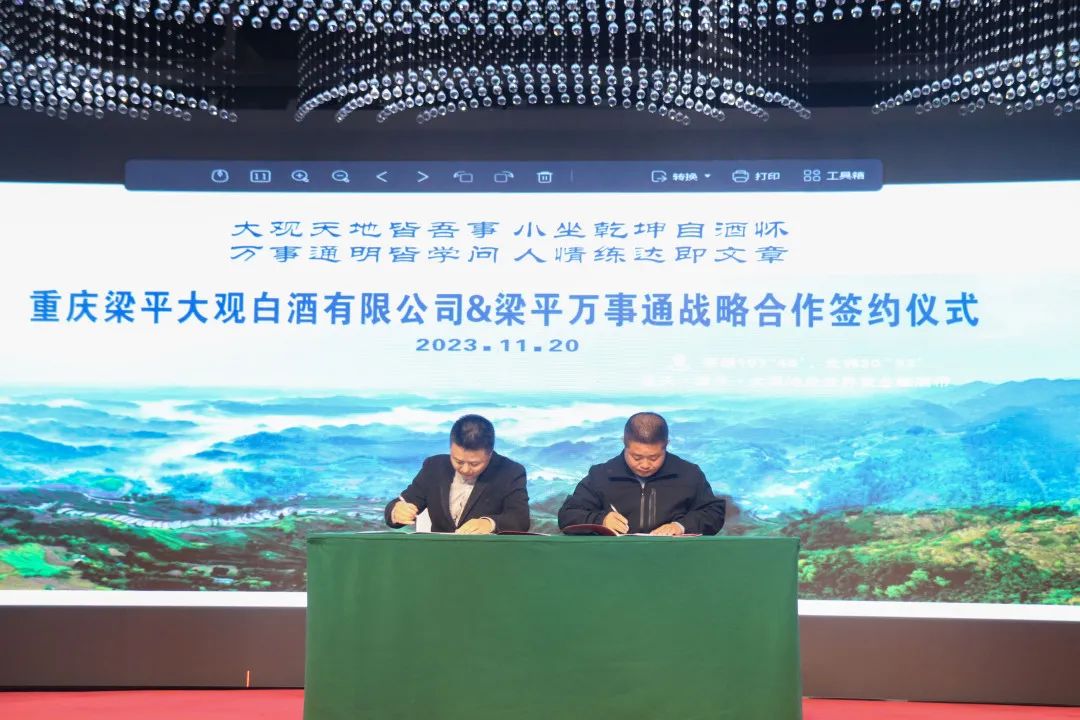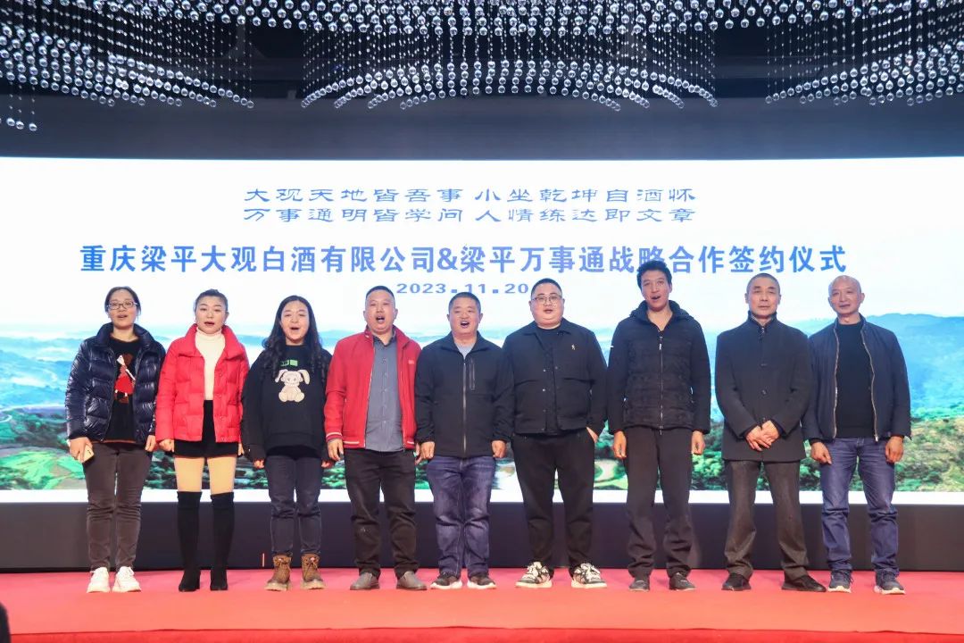 梁平万事通对大观白酒的文化和价值认同给予了充分肯定,大观白酒方也对万事通未来的推广方向充满了信心,同时也对梁平万事通的业务寄予了厚望。发展才能合作,合作才能共赢。双方以此次签约为起点,做强做精大观白酒的品牌宣传,推动双方在合作共赢的道路上行稳致远。