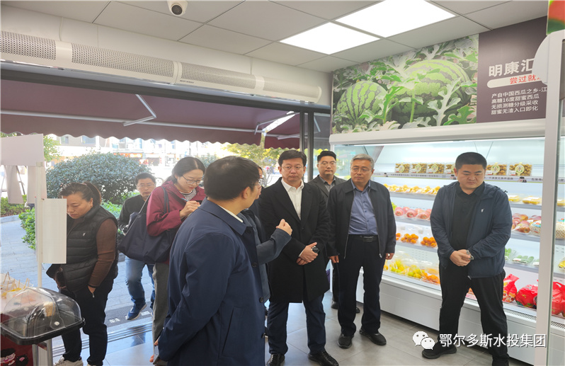 (图:市农牧局副局长王宇飞、市水投集团党委委员、副总经理杨永华以及市农牧局相关干部考察组一行前往明康汇生态农业集团的社区店进行实地调研)