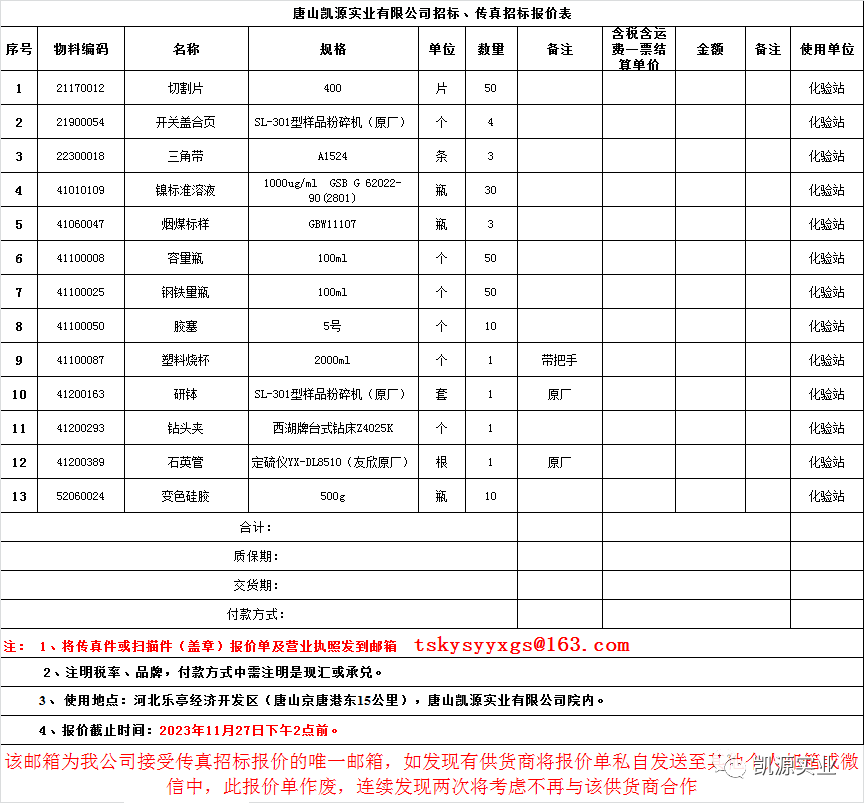 公司拟对化验用品实行招标采购,请于2023年11月27日下午14点之前将投标文件发至tskysyyxgs@163.com(加盖公章有效),报价要求:要注明所能供应质保期、供货期、付款方式及联系方式,提供公司资质。我公司根据各供应商报价由低到高综合选择。该邮箱为我公司接受传真招标报价的唯一邮箱,如发现有供货商将报价单私自发送至其他个人邮箱或微信中,此报价单作废,连续发现两次将考虑不再与该供货商合作。