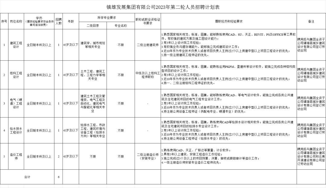 根据第一轮招聘人员报名情况,结合公司工作岗位实际需要,经集团公司班子讨论研究,现对部分初审合格人员空缺岗位调整招聘条件再次进行公开招聘,岗位详情见附件1:镇雄发展集团有限公司2023年第二轮人员招聘计划表。