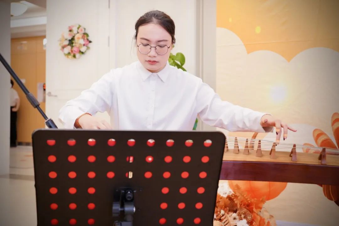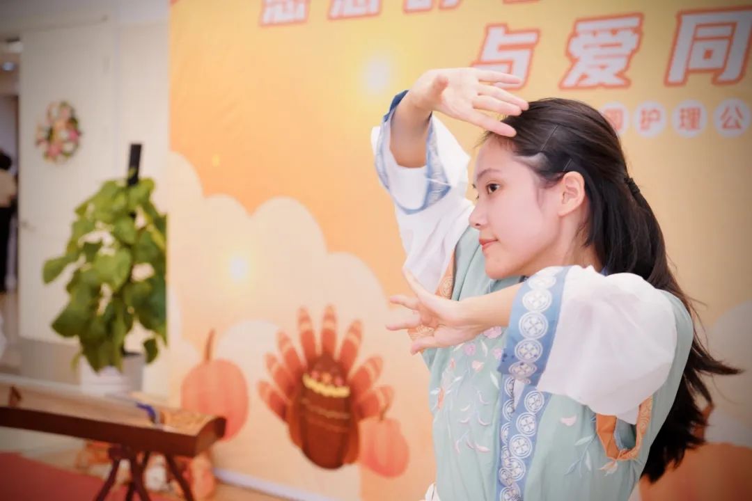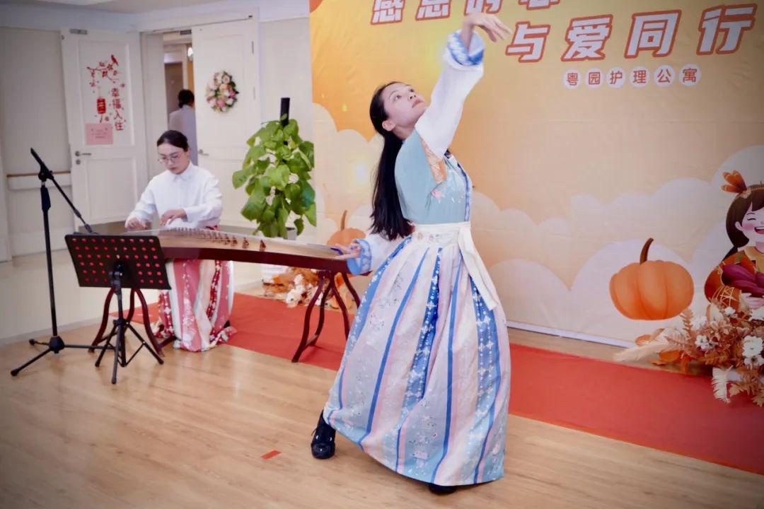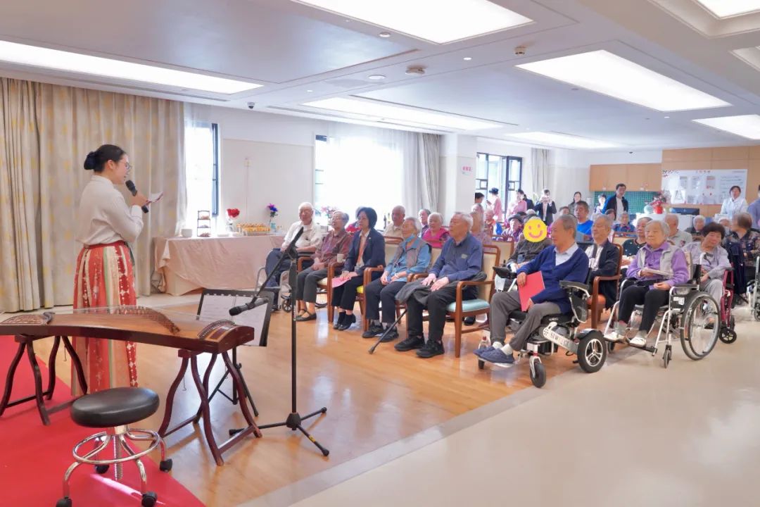 开场之际,护理文娱活动师团队带来一曲《春江花月夜》古筝及舞蹈表演,伴随清耳悦心的美妙旋律,文娱伙伴以曼妙的舞姿在乐声中翩翩起舞,与爷爷奶奶们相视互动。而长辈们也随着旋律不由自主地舞动起来,活动现场气氛逐渐变得欢快而热烈。