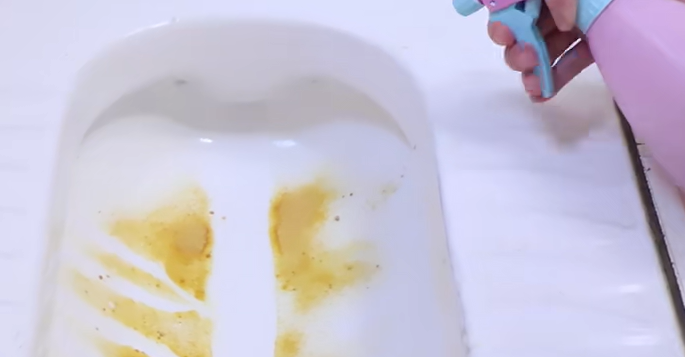第四个用途是清洁马桶黄渍。马桶黄渍非常顽固,我们可以将这款溶液喷洒在马桶表面,然后用马桶刷刷洗。因为小苏打的清洁能力非常强,而白酒则具有很好的杀菌消毒作用,抑制细菌滋生。这样就能快速地将马桶清洁干净了。冲洗干净后,你会发现马桶变得非常干净,脏东西全都消失了。