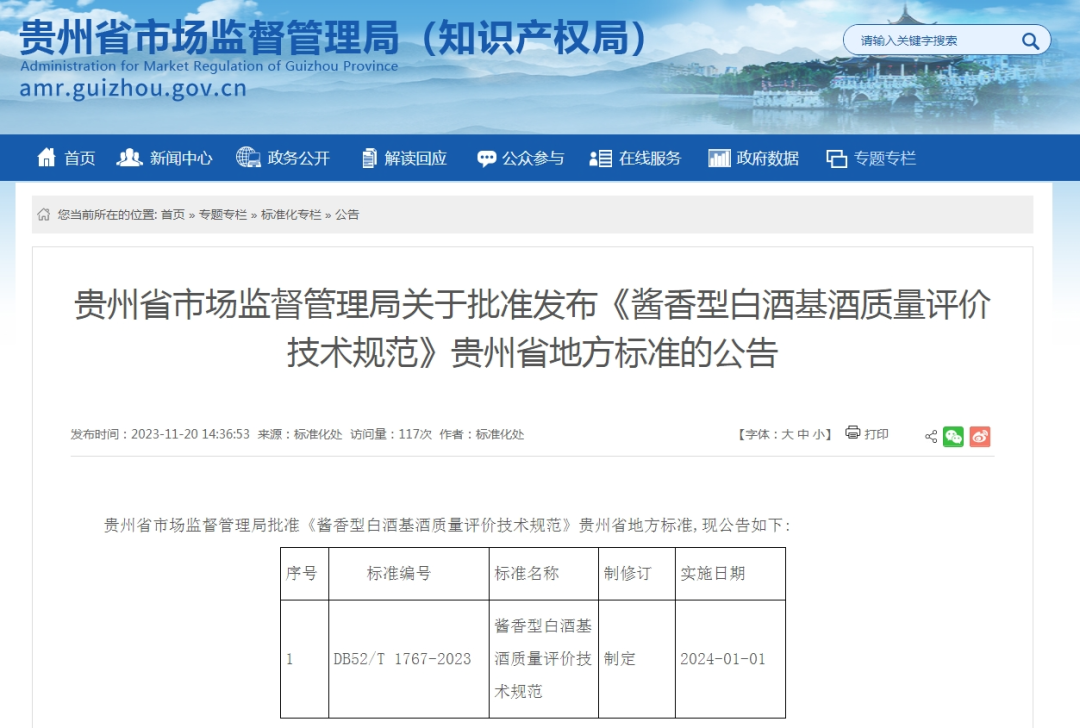 近日,贵州省市场监督管理局官网11月20日发布公告,批准《酱香型白酒基酒质量评价技术规范》贵州省地方标准,标准编号为:DB52/T 1767-2023,自2024年1月1日起实施。