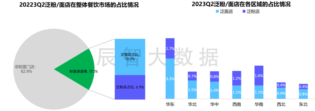那粉面市场到底有多大?我们把粉面渗透的餐厅加在一起,中国超过17%的门店都在卖粉面,南粉北面的结构是非常明显的,华南最多的就是粉,北方基本上以面为主。但是华东成了粉面交战最集中的市场。我们看到蒙自源把总部搬到上海,五爷拌面也来了我们上海园区,一个北方往南走,一个南方往北走,都来了上海,华东成为了粉面争夺的焦点。