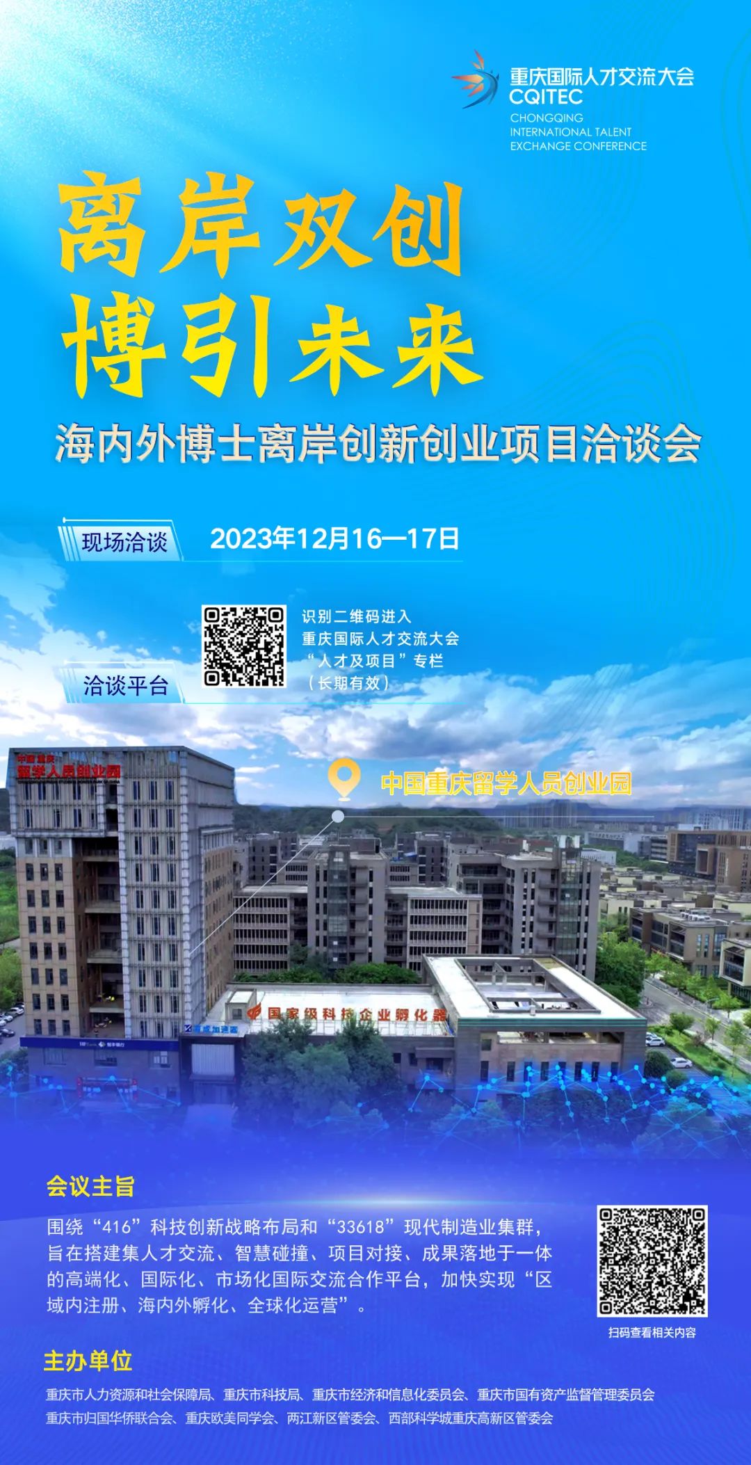 作为2023重庆国际人才交流大会重要活动,以“离岸双创 博引未来”为主题的海内外博士离岸创新创业项目洽谈会(以下简称:洽谈会)将于12月16日—17日举办。洽谈会由重庆市人力资源和社会保障局、重庆市科技局、重庆市经济和信息化委员会、重庆市国有资产监督管理委员会、重庆市归国华侨联合会、重庆欧美同学会、两江新区管委会、西部科学城重庆高新区管委会联合主办,围绕“416”科技创新战略布局和“33618”现代制造业集群,旨在搭建集人才交流、智慧碰撞、项目对接、成果落地于一体的高端化、国际化、市场化国际交流合作平台。以面对面对接洽谈、城市人才生态体验、落地平台考察、落地单位实地对接为活动内容,拟邀请1000名左右海内外一流高校、科研院所、企事业单位的优秀博士、博士后来渝开展技术成果转移转化合作。同时,面向能满足“有自主研发关键核心技术,能解决重庆市现代制造业集群体系建设中‘卡脖子’难题”“有研发、技术、创新成果转移转化意向合作项目”“有良好发展前景的创新、创业项目”“有投融资合作意向”“有开展离岸研发、离岸贸易经营业务经历”“有来渝合作发展意向”其中一项者进行需求征集。目前已征集海内外博士离岸创新创业项目420个,包含500名博士人才,海外项目271个,占总项目的近2/3,涉及的行业超过30个,主要有智能制造设备、生物医药、AI及机器人、新能源及新型储能、前沿新材料等。为保障成果转化落地,洽谈会依托中瑞(重庆两江)产业园、金凤实验室、西部创投中心、明月湖融合创新中心、育成孵化加速器等组建专业技术协作团,为人才项目提供技术协作和对接服务保障。此外,还结合人才及项目需求信息,由专业技术协作团按照需求与产业的契合度分梯队、分批次、精准匹配,并组建项目跟进团队,协助专业技术协作团对匹配项目进行点对点实时跟进,促进供需双方达成合作意向。洽谈会将促成一批意向合作项目和落地项目,后期将与各区县产业相结合,促成项目成果转化,实现“区域内注册、海内外孵化、全球化运营”双向离岸创新创业目标,激发高层次人才创新创业活力,推动现代化新重庆高质量发展。“本次洽谈会作为重庆引进高端人才的重要举措,对推进人才双向离岸创新创业、推动产业转型升级及高质量发展发挥重要作用。”主办方相关负责人表示,将继续长期征集人才项目信息,动态发布活动信息,保证洽谈交流平台长期有效,根据后续项目供需情况做好精准匹配、对接落地等工作。请登录网址(http://www.cqtalent.com/hyjh-admin/gch/gchrcregformpage1)重庆国际人才交流大会“人才及项目”专栏在线填写或扫描下方二维码直接填写。